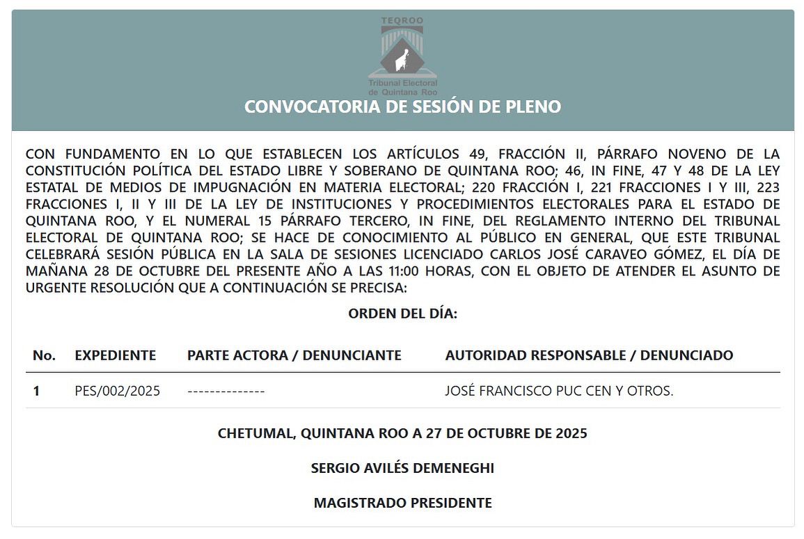José María Morelos, 29 de octubre. – El Tribunal Electoral de Quintana Roo (TEQROO) decidió reenviar a la autoridad instructora el expediente del procedimiento especial sancionador número 2 del año, promovido contra José Francisco Puc Cen, ex candidato a la presidencia municipal de José María Morelos por Movimiento Ciudadano.