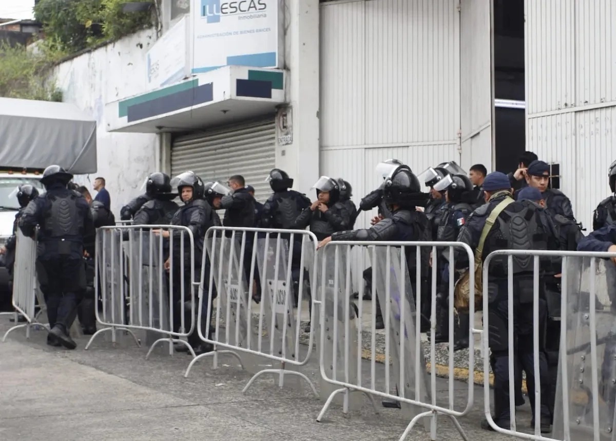 Las bodegas del OPLE en Xalapa fueron resguardadas este miércoles por elementos de la Secretaría de Seguridad Pública estatal, que portaban equipos antimotines; además, las autoridades colocaron vallas metálicas para controlar el acceso.