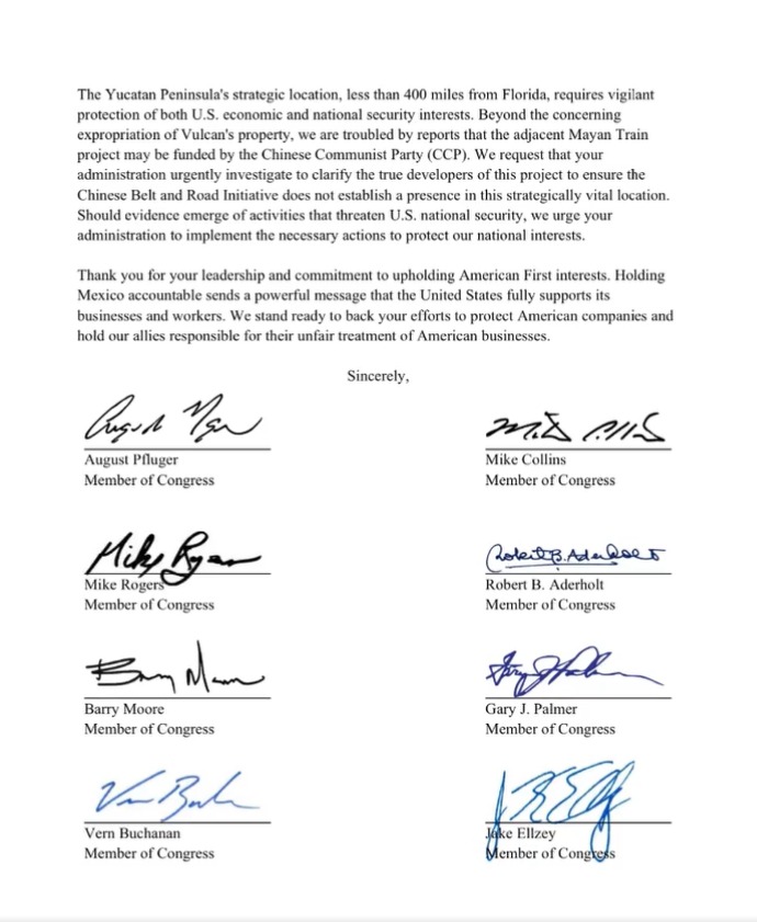 La ubicación estratégica de la Península de Yucatán, a menos de 400 millas de Florida, requiere una protección vigilante de los intereses económicos y de seguridad nacional de EE. UU. Más allá de la preocupante expropiación de la propiedad de Vulcan, nos inquietan los informes de que el proyecto del Tren Maya podría estar financiado por el Partido Comunista Chino (PCCh). Solicitamos que su administración investigue con urgencia para esclarecer quiénes son los verdaderos desarrolladores de este proyecto y asegurar que la Iniciativa de la Franja y la Ruta de China no establezca una presencia en esta ubicación estratégicamente vital. Si se encontraran pruebas de actividades que amenacen la seguridad nacional de EE. UU., instamos a su administración a tomar las medidas necesarias para proteger nuestros intereses nacionales.