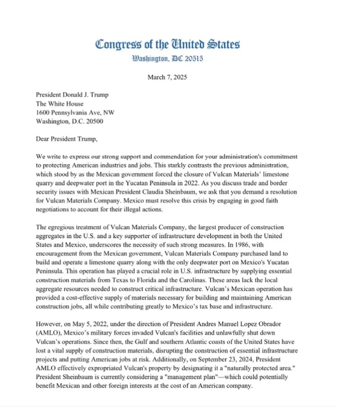 “Mientras usted discute temas de comercio y seguridad fronteriza con la presidenta de México, Claudia Sheinbaum, le solicitamos que exija una solución para Vulcan Materials Company. México debe resolver esta crisis mediante negociaciones de buena fe para remediar sus acciones ilegales”, se lee en el documento fechado el 7 de marzo de 2025.