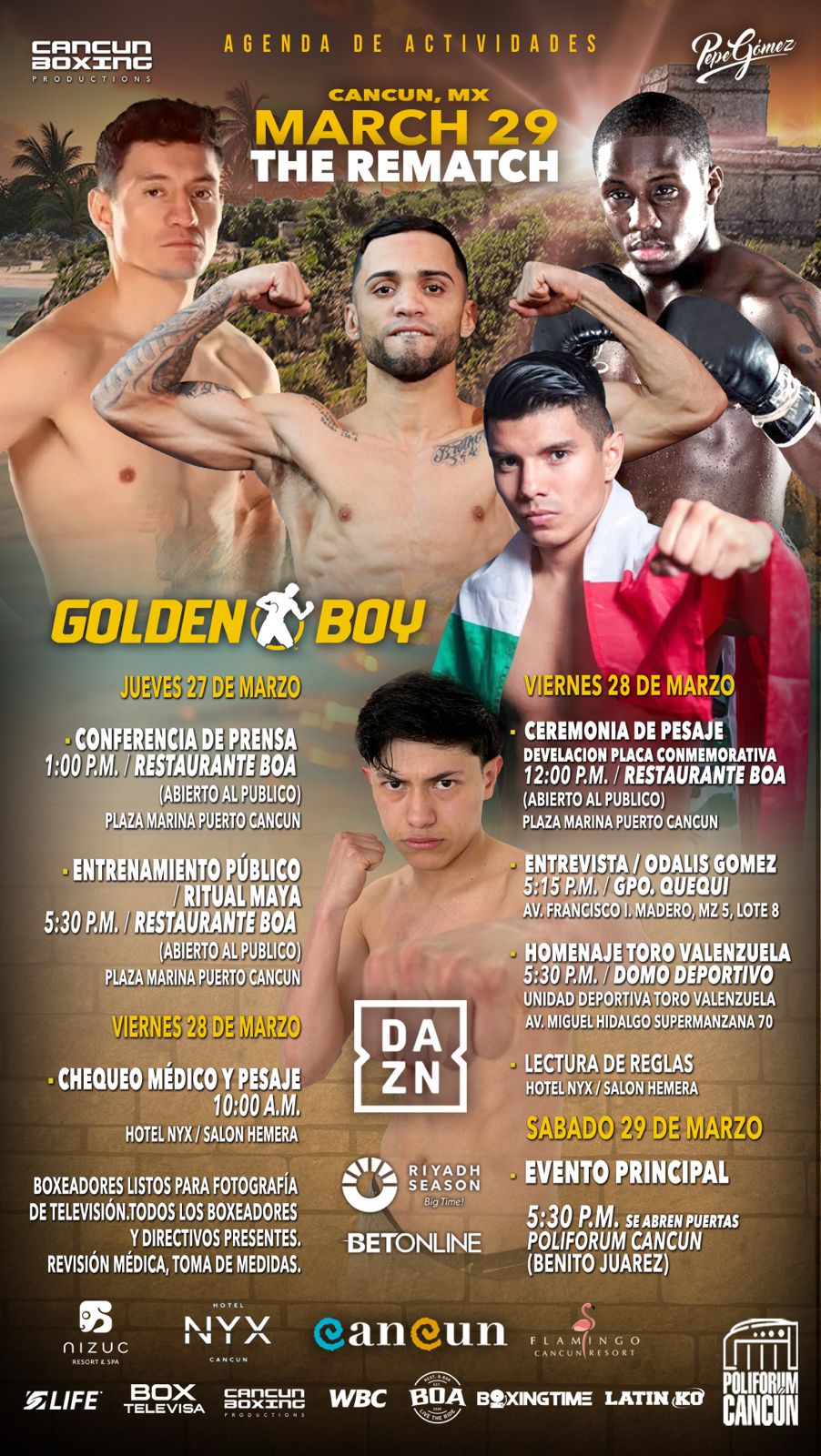 CANCÚN, Q. ROO a 25 de marzo.- La cuenta regresiva para la gran función “The Rematch” (La Revancha), programada para el sábado 29 de marzo, ha comenzado y la agenda de actividades inició hoy martes con la llegada de los boxeadores a Cancún, mismos que estarán presentes el día jueves en la conferencia de prensa la cual se realizará en un restaurante deportivo de una de las plazas comerciales más exclusivas del -Caribe Mexicano-.