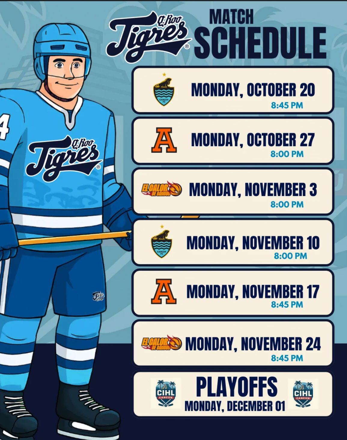 Los juegos del equipo Tigres serán del 20 de octubre al 24 de noviembre todos los lunes a las 8 de la noche, en la espectacular pista de hielo Happi Arena Cancún, ubicada en Grand Outlet Riviera Maya.