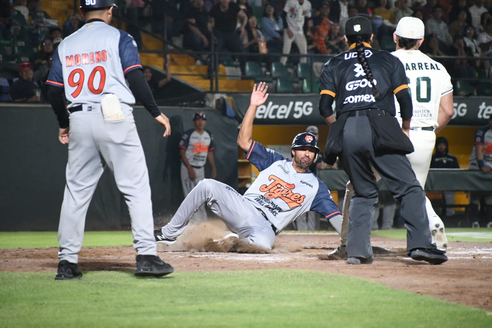 Al tiempo que la voltereta a favor de los bengalíes llegó en la quinta tanda con un rally de cinco zarpazos, de los cuales uno llegó con sencillo impulsor de Gabriel Cancel, otro con rodado remolcador de Agustín Murillo, además de un par con indiscutible al prado derecho de Alexis Wilson, sellando el ataque con un registro de Robinson Cabrera tras un error del receptor Juan Kirk.