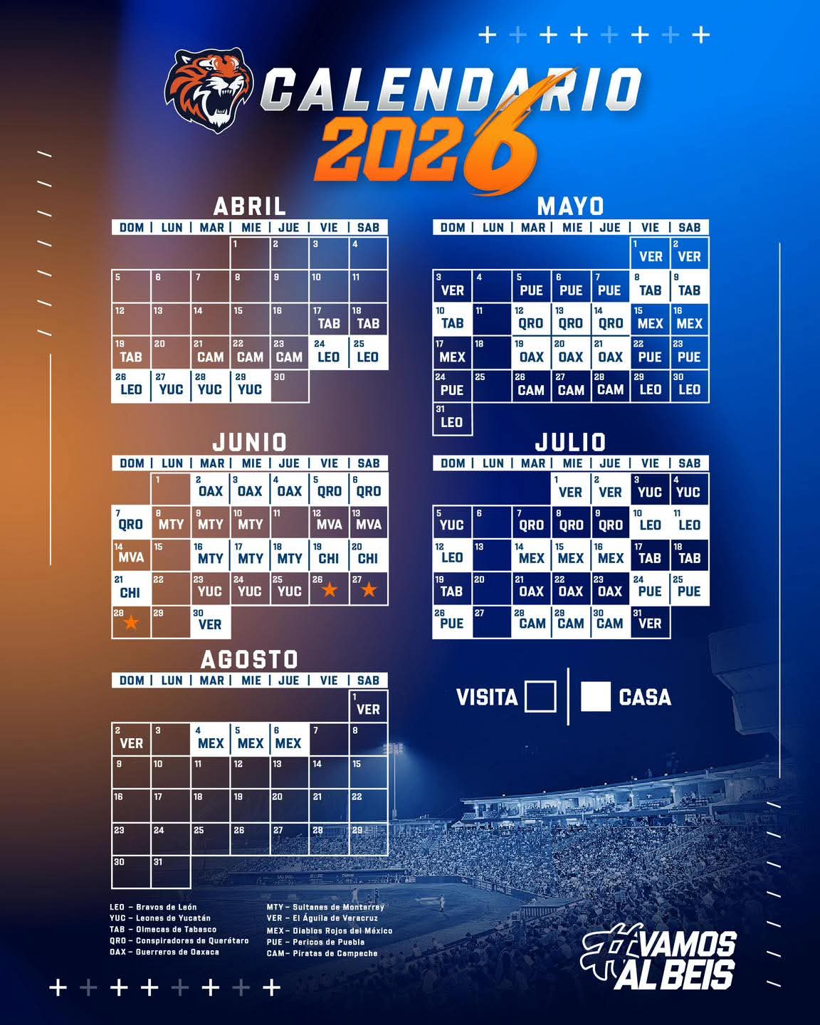 A continuación presentamos el calendario 2026 de los Tigres de Quintana Roo: