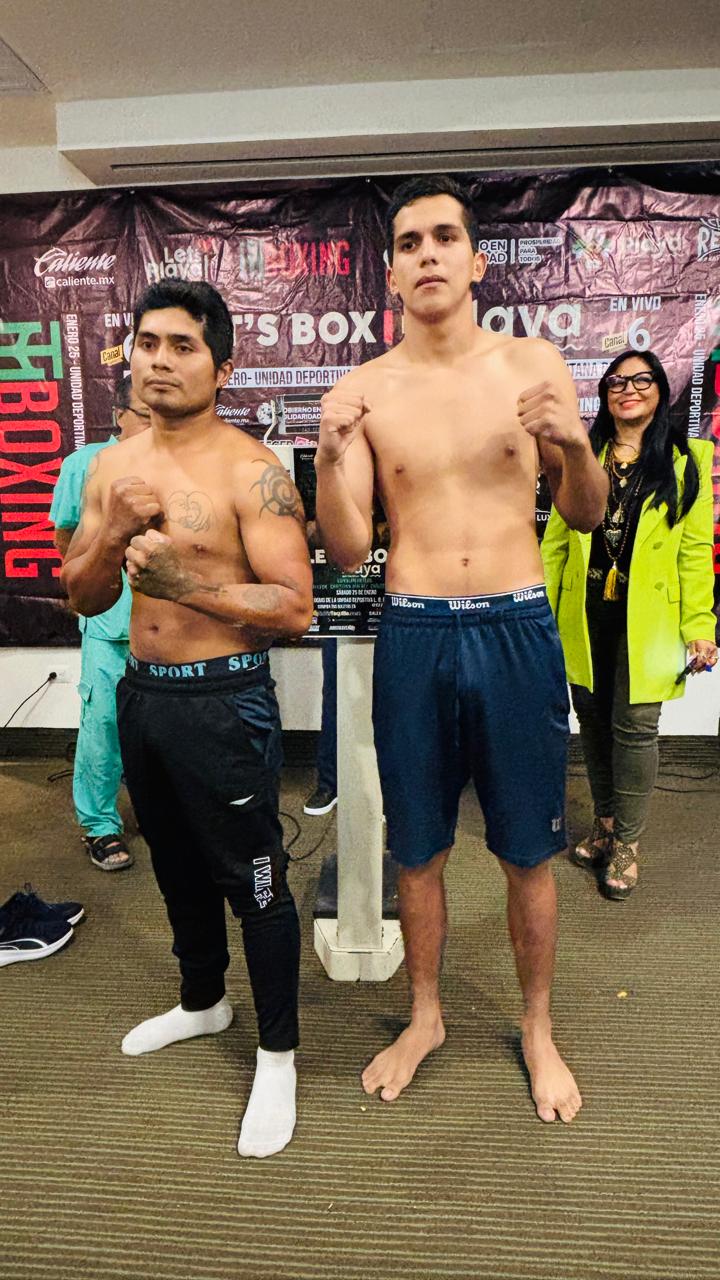 En peso ligero a 4 asaltos, se enfrentan Diego Leandro Cruz de Playa del Carmen y quien debuta con 60.500 kilos ante Misael Aguilar Espinoza de Playa del Carmen, que tiene récord de 1 pelea disputada, 1 ganada y pesó 60 kilos con 500 gramos.