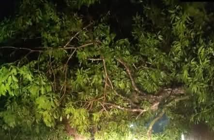 Los fuertes vientos que se registraron y la torrencial lluvia ocasionó algunos daños y suspensión de servicios debido a la casida de árboles y cableados en toda esa región.
