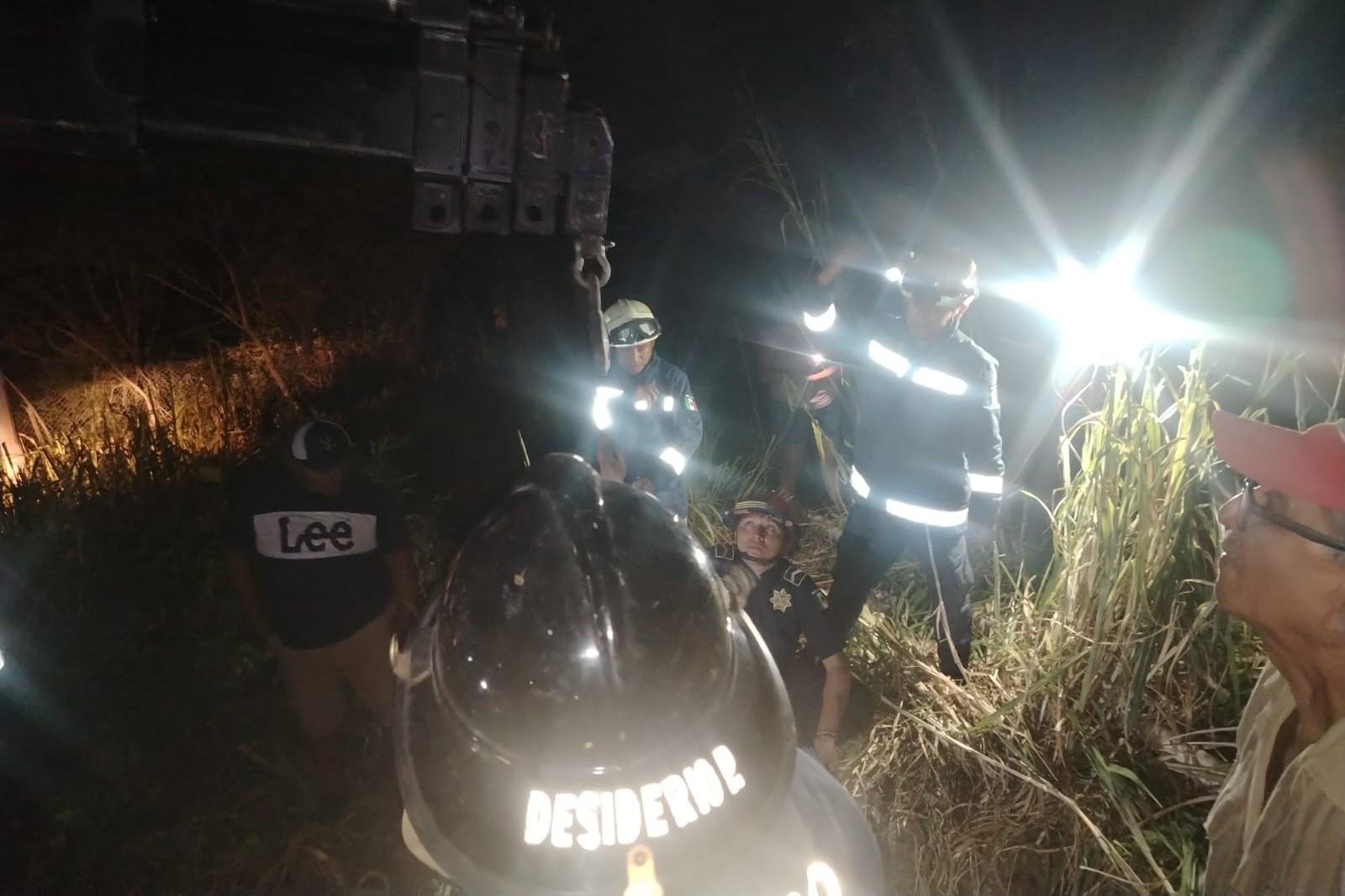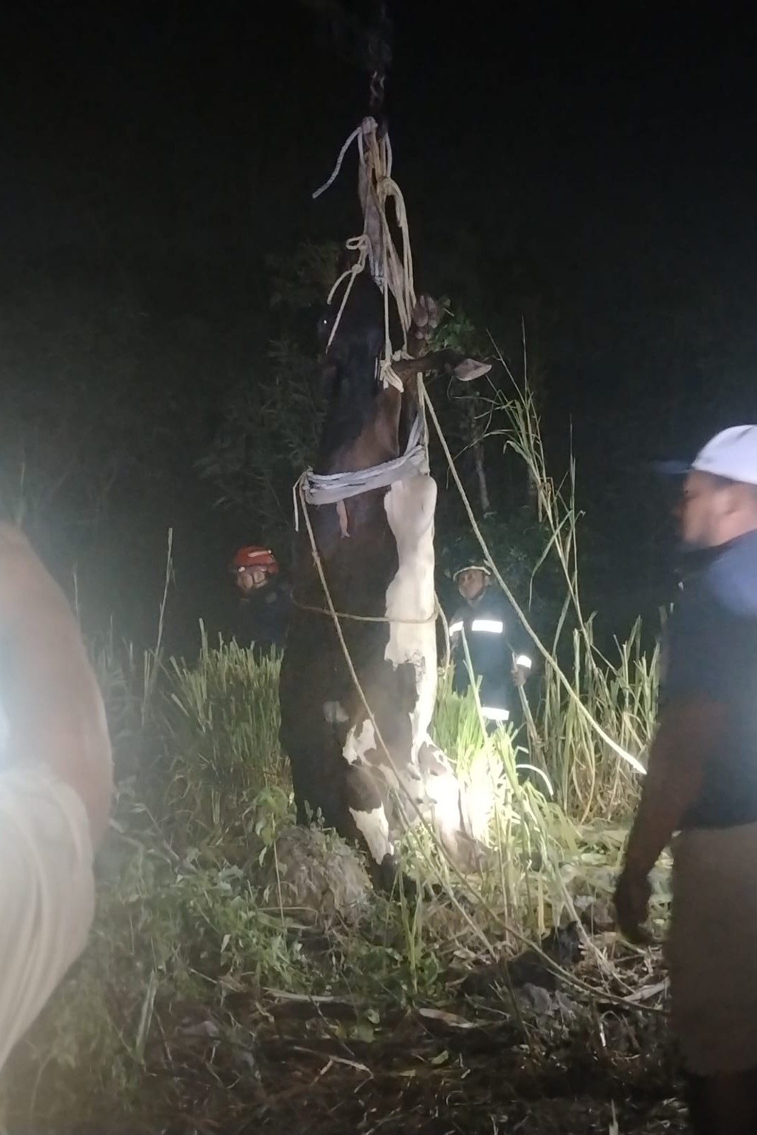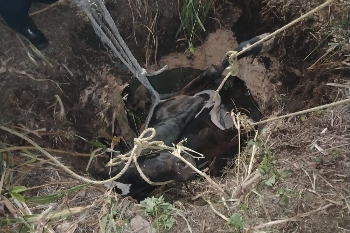 Hasta el lugar arribo una unidad de rescate del departamento de bomberos de la SSP, así como varías unidades de la policía municipal y estatal, así como una grúa particular. Con el apoyo de unas cuerdas y arneses, se logró amarrar al rumiante y con el apoyo de la grúa fue sacado del hoyo, hasta dejarlo en la superficie sano y salvo.