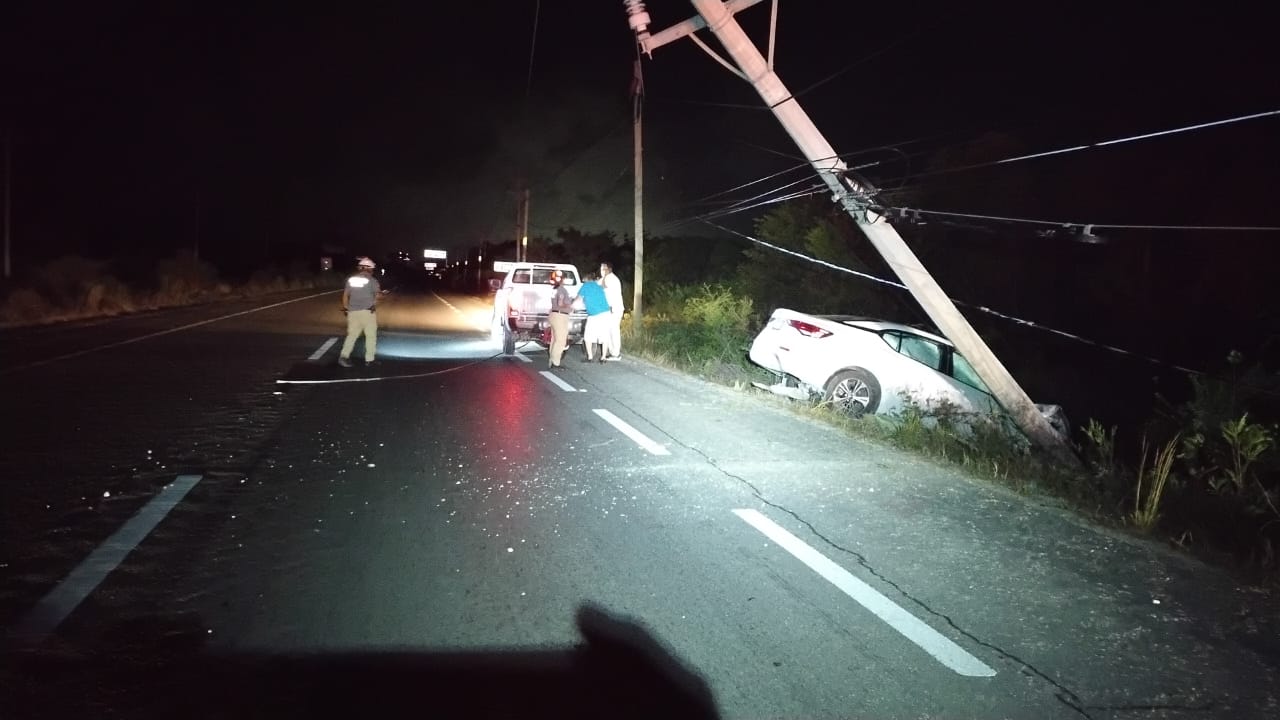 TULUM, 4 de junio.— Un empleado del grupo Xcaret protagonizó un aparatoso accidente la madrugada de este miércoles, luego de quedarse dormido al volante y salirse del camino, impactando su vehículo contra un poste de la Comisión Federal de Electricidad (CFE), el cual quedó suspendido por las líneas eléctricas tras el impacto.