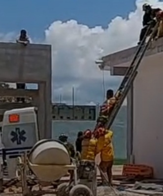 Playa del Carmen, a 12 de agosto.- Trabajador de la construcción recibe fuerte descarga eléctrica al momento de tocar un cable de mediana tensión durante los trabajos en la azotea de una construcción al interior de un predio perteneciente al Sindicato de Volqueteros “José Quiam Chan”, ubicado en la avenida 35 Sur, frente a la calle 1ra bis. Sur de la colonia Centro de Playa del Carmen.