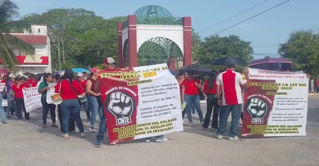 Docentes de Tizimín tomaron las calles en apoyo al paro nacional, exigiendo la derogación de la Ley del ISSSTE.
