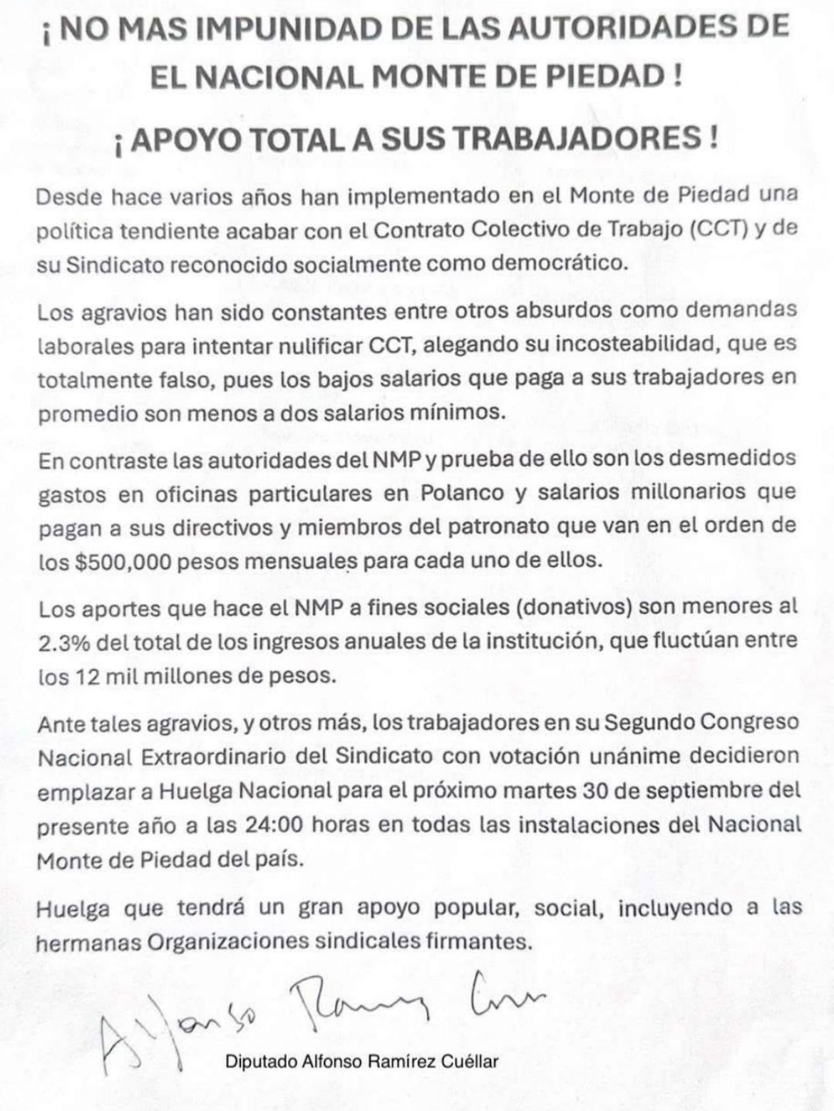 “El Nacional Monte de Piedad ha incumplido con los trabajadores al violentar el contrato colectivo de trabajo con agravios constantes y absurdos, con la intención no solo de no respetar los acuerdos alcanzados en marzo pasado, sino de anular el contrato colectivo de trabajo y el sindicato, por ello se ha emplazado a huelga este 30 de septiembre con el respaldo de 17 organizaciones adheridas a la Asociación General de Trabajadores y Trabajadores y todo indica que el movimiento será indefinido.”