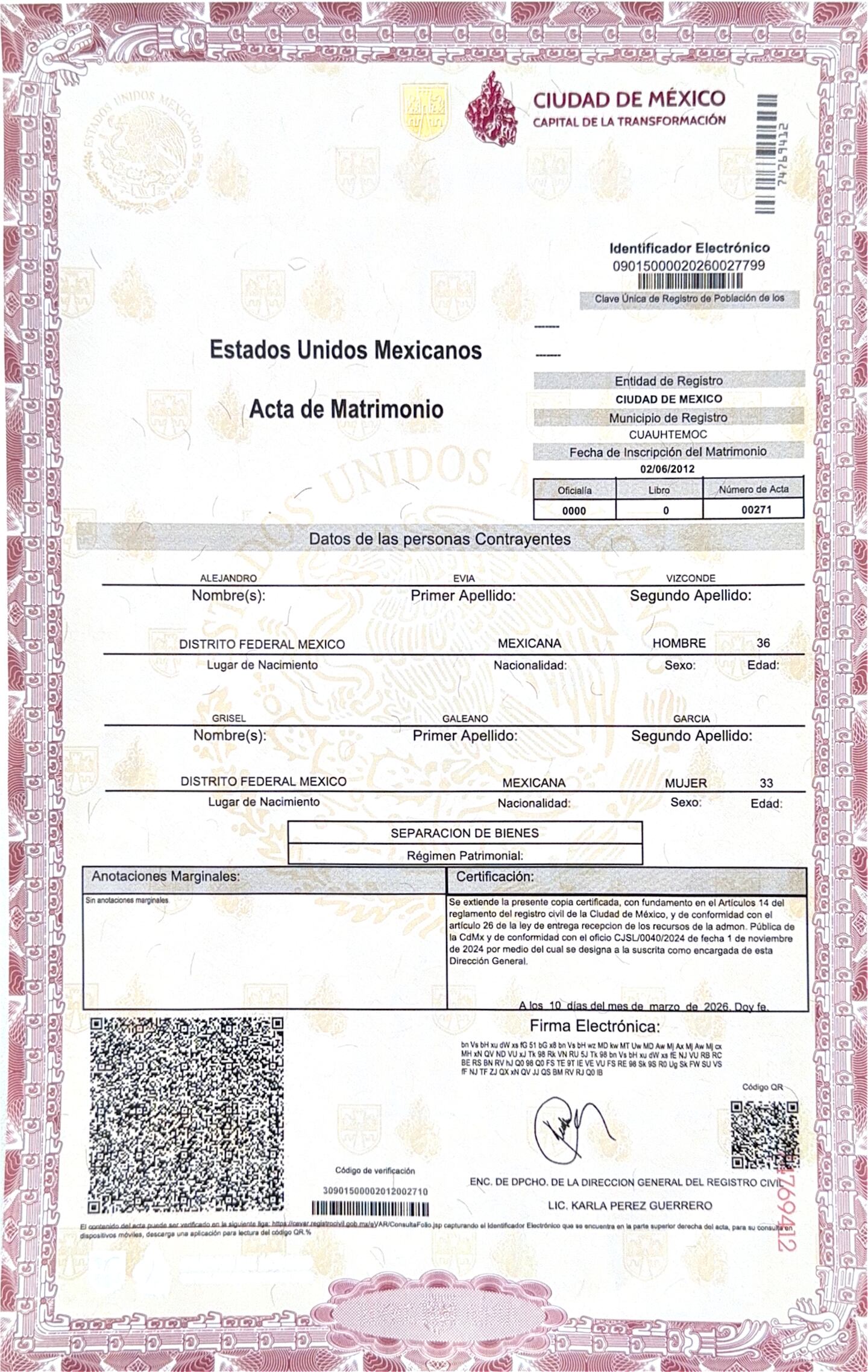Resulta que la esposa de Alejandro Evia Vizconde no es una abogada cualquiera -redoble de tambores-: es, ni más ni menos, que la procuradora fiscal de la Federación, Grisel Galeano García. ¿Cómo les quedó el ojo? ¡Cuadrado! Este matrimonio es un hecho. Así se desprende del acta de matrimonio, inscrita el 2 de junio de 2012, número de acta 00271. En aquellos ayeres, Alejandro Evia tenía 36 años y Grisel Galeano, 33 años.