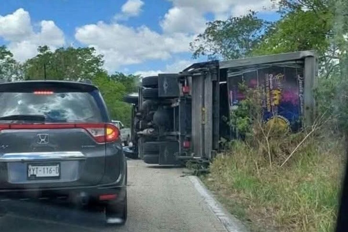 El vehículo pesado transitaba por esa vía llevando el equipo técnico para una presentación de dicha agrupación originaria de Calkiní, Campeche, pero de pronto sobrevino el accidente, cuyos motivos se desconocen, quedando el vehículo volcado parcialmente sobre la cinta asfáltica.