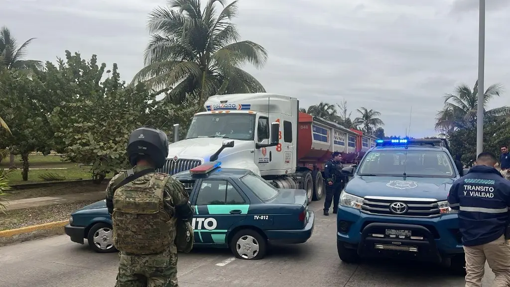 El accidente ocurrió al norte del Puerto de Veracruz, cuando un tráiler arrastró a una patrulla sobre la avenida Fidel Velázquez, sorprendiendo a los usuarios de redes sociales