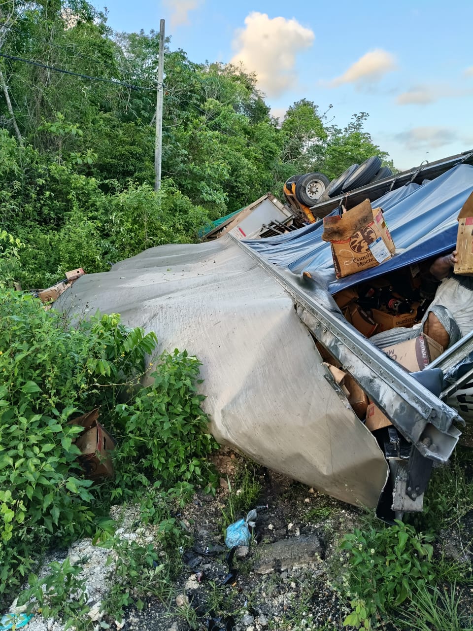 TULUM a 11 de junio . — Un tráiler de doble remolque que transportaba cartones de cerveza volcó esta mañana sobre la carretera federal 307, en el tramo Felipe Carrillo Puerto–Tulum, provocando afectaciones viales y actos de rapiña por parte de pobladores que se llevaron gran parte de la carga.