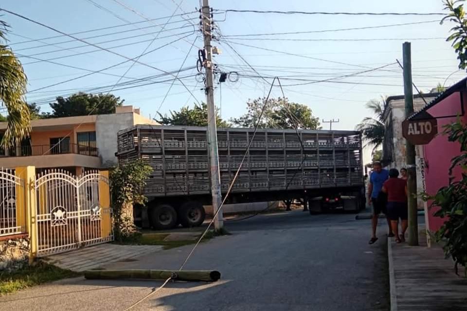 TIXKOKOB, YUC., 28 de noviembre.- Un tráiler derribó varios postes de telefonía en Tixkokob al realizar una mala maniobra en una vuelta y no medir bien su distancia. Los hechos se registraron sobre la calle 13 entre 24, cuando el tráiler ocasionó el percance a unas cuadras del centro de Tixkokob.