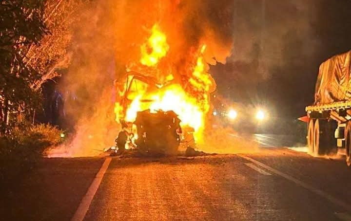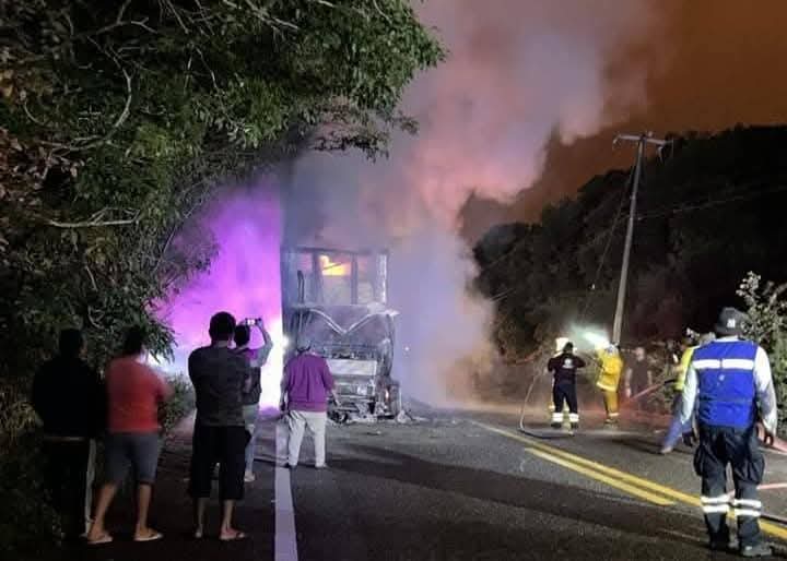 Este iba cargado con sacos de Maseca y el operador de la pesada unidad logró salir de la cabina antes de que el fuego lo atrapara.