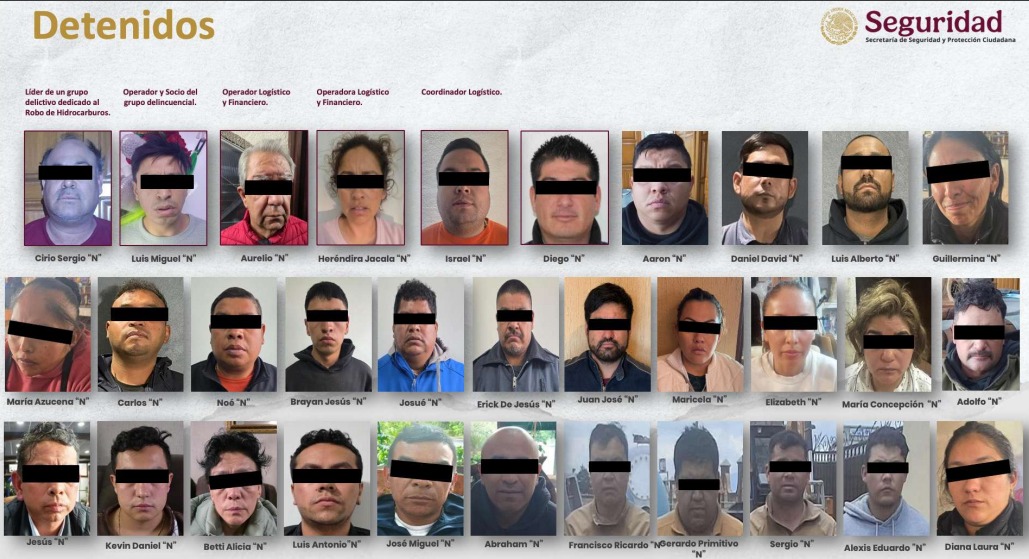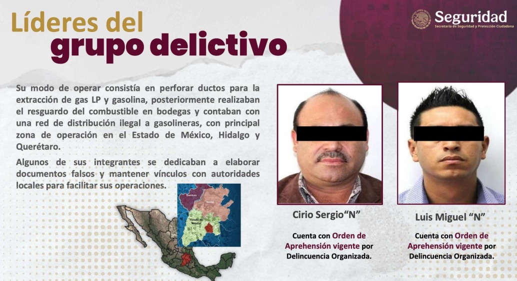 De acuerdo con las investigaciones, este grupo criminal estaba liderado por Cirio Sergio “N” y Luis Miguel “N”, con zona de operación en el Estado de México, Hidalgo y Querétaro, donde coordinaban el robo de hidrocarburos a gran escala.