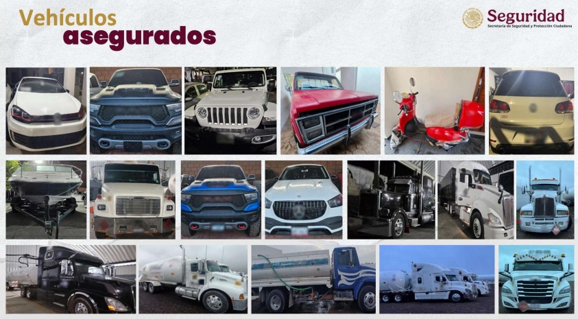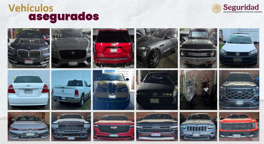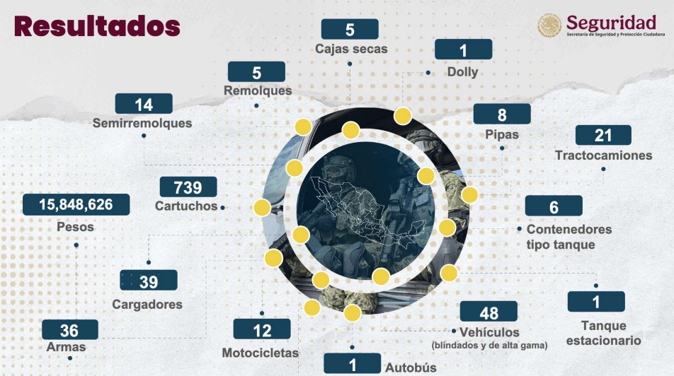 21 tractocamiones, 14 semirremolques, cinco remolques, 14 contenedores tipo tanque y autotanques, ocho pipas, cinco cajas secas, un tanque estacionario, 48 vehículos, algunos blindados y de lujo, un autobús, 12 motocicletas, 36 armas de fuego, una bodega de almacenamiento, diversas dosis de droga y cajas de medicamento controlado, se clausuraron también, dos tomas clandestinas, además, se aseguraron casi 16 millones de pesos en efectivo, y también se rescataron diversos animales exóticos que fueron puestos a disposición de Profepa.