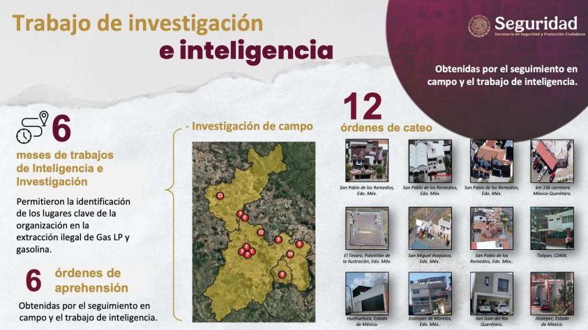En la alcaldía de Tlalpan, en la Ciudad de México se realizó un despliegue coordinado con la policía de la Ciudad de México, con la Secretaría de Seguridad Ciudadana del gobierno de la Ciudad de México, donde se detuvo a Luis Miguel “N”, alias “Flaco de oro”, uno de los principales líderes de la célula delictiva encargado de organizar a los operadores que trasladan el hidrocarburo en la carretera Querétaro-México, así como en los estados de Hidalgo y Querétaro, además, cuenta con una orden de aprehensión por delincuencia organizada.