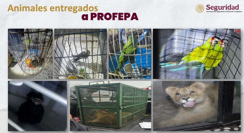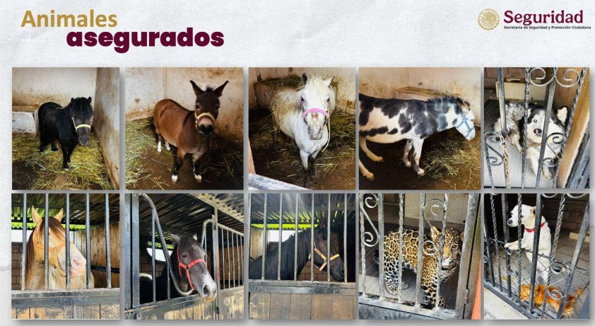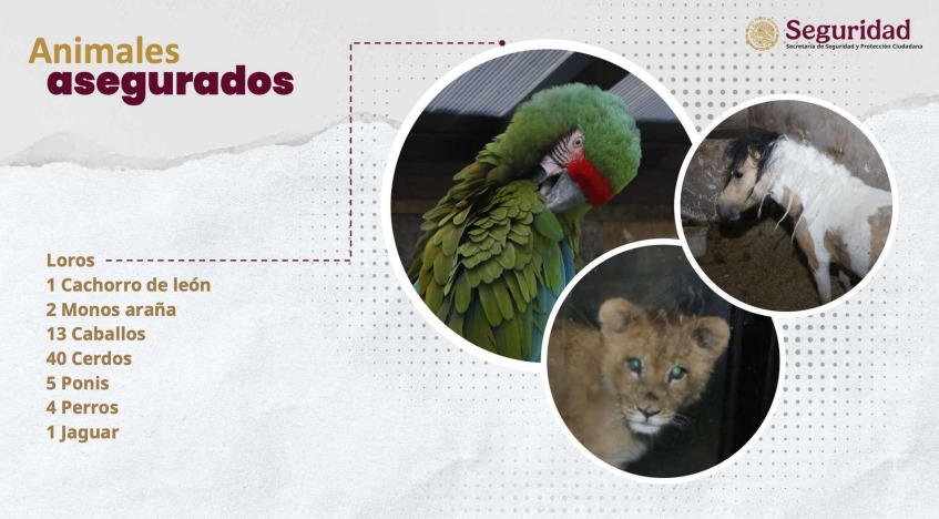 En estos inmuebles se aseguró armamento, cartuchos, vehículos dinero en efectivo, cuatro pipas de gas, caballos y se rescataron animales exóticos como dos cachorros, uno de jaguar y otro de león, aves silvestres y monos araña, los cuales fueron puestos a disposición de Profepa para garantizar su atención y rehabilitación.