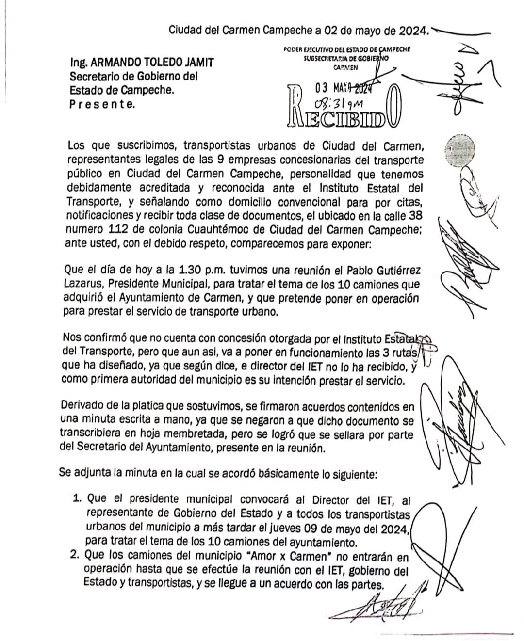 Sin embargo, desde el año pasado, el presidente municipal Pablo Gutiérrez Lazarus mantiene en operación los camiones municipales “Amor X Carmen”, a pesar de no contar con los permisos necesarios de la Agencia Reguladora del Transporte del Estado de Campeche (ARTEC).