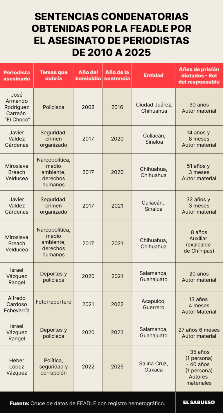 Desde julio de 2010 —fecha en la que se creó la Fiscalía Especial para la Atención de Delitos cometidos contra la Libertad de Expresión (FEADLE)— hasta septiembre de 2025 en México se han obtenido únicamente nueve sentencias condenatorias por el asesinato de periodistas y cuatro por tentativa de homicidio, según el último informe semestral de la fiscalía. Pero organizaciones han documentado al menos 126 periodistas asesinados y 17 desaparecidos en los últimos 15 años.