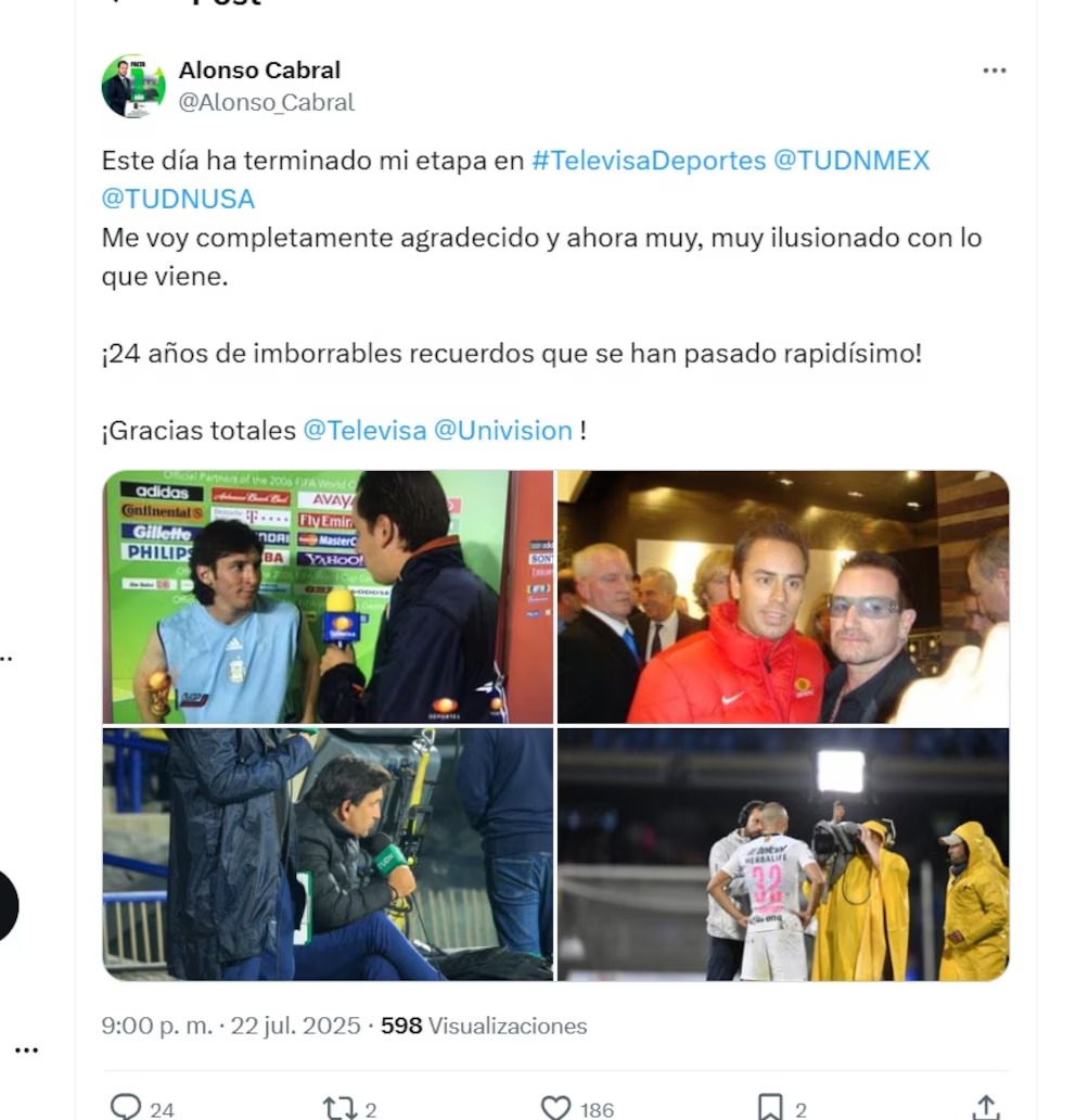 “Este día ha terminado mi etapa en Televisa Deportes @TUDNMEX @TUDNUSA. Me voy completamente agradecido y ahora muy, muy ilusionado con lo que viene. ¡24 años de imborrables recuerdos que se han pasado rapidísimo! ¡Gracias totales @Televisa @Univision!“, publicó.