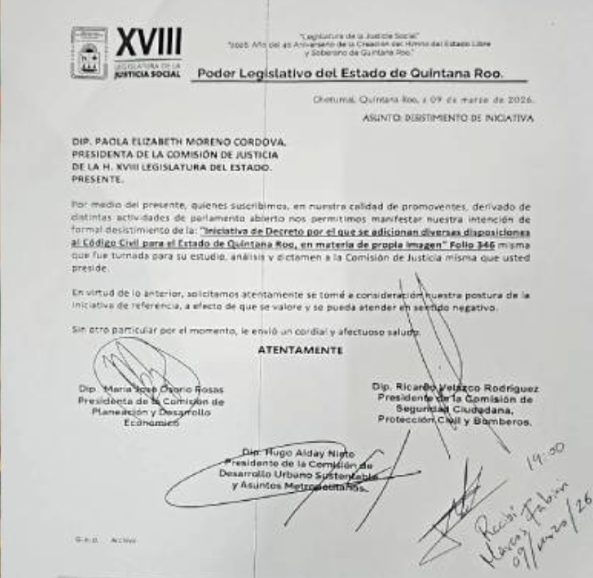 CHETUMAL, 9 de marzo.- La diputada María José Osorio, del PVEM; y los diputados Hugo Alday Nieto, del PT, y Ricardo Velazco, de Morena, retiraron la iniciativa de reforma al Código Civil del Estado de Quintana Roo en materia de propia imagen, luego del rechazo de periodistas, medios de comunicación y organizaciones civiles a sus excesos e imprecisiones.