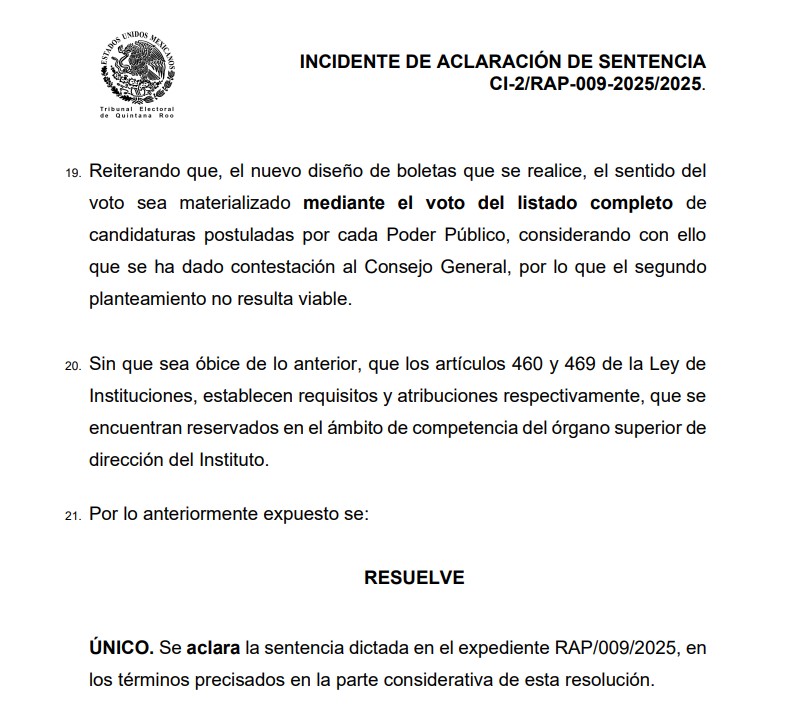 El Teqroo ordenó lo anterior al resolver una solicitud de aclaración de sentencia que presentó el Instituto Electoral de Quintana Roo (Ieqroo), sobre los alcances de los efectos de la resolución anterior que ordenó modificar el diseño de las boletas electorales, sentencia en la que pidió que las listas de postuladas por los poderes Ejecutivo, Legislativo y Judicial aparezcan completas, aunque los nombres de los candidatos se repitan dos o tres veces.