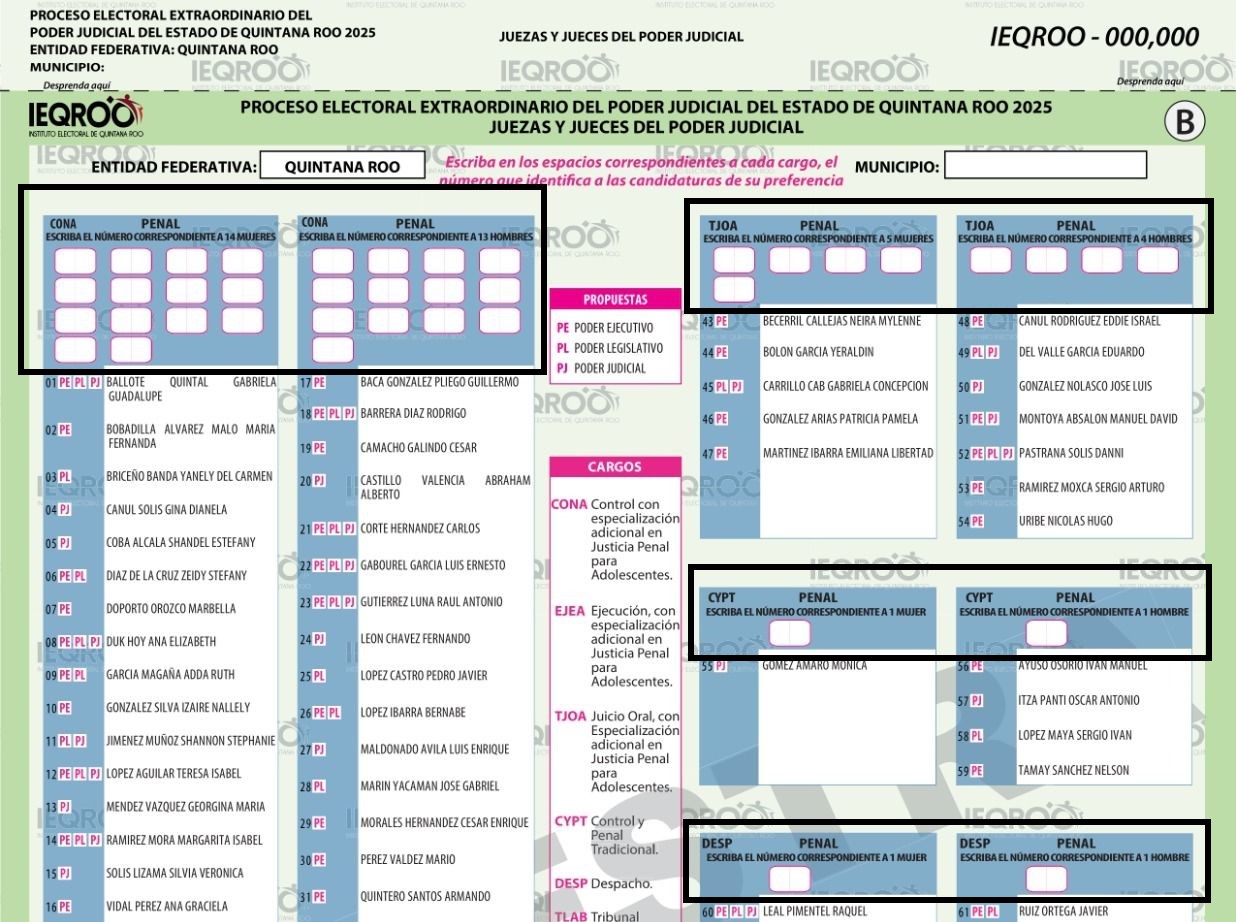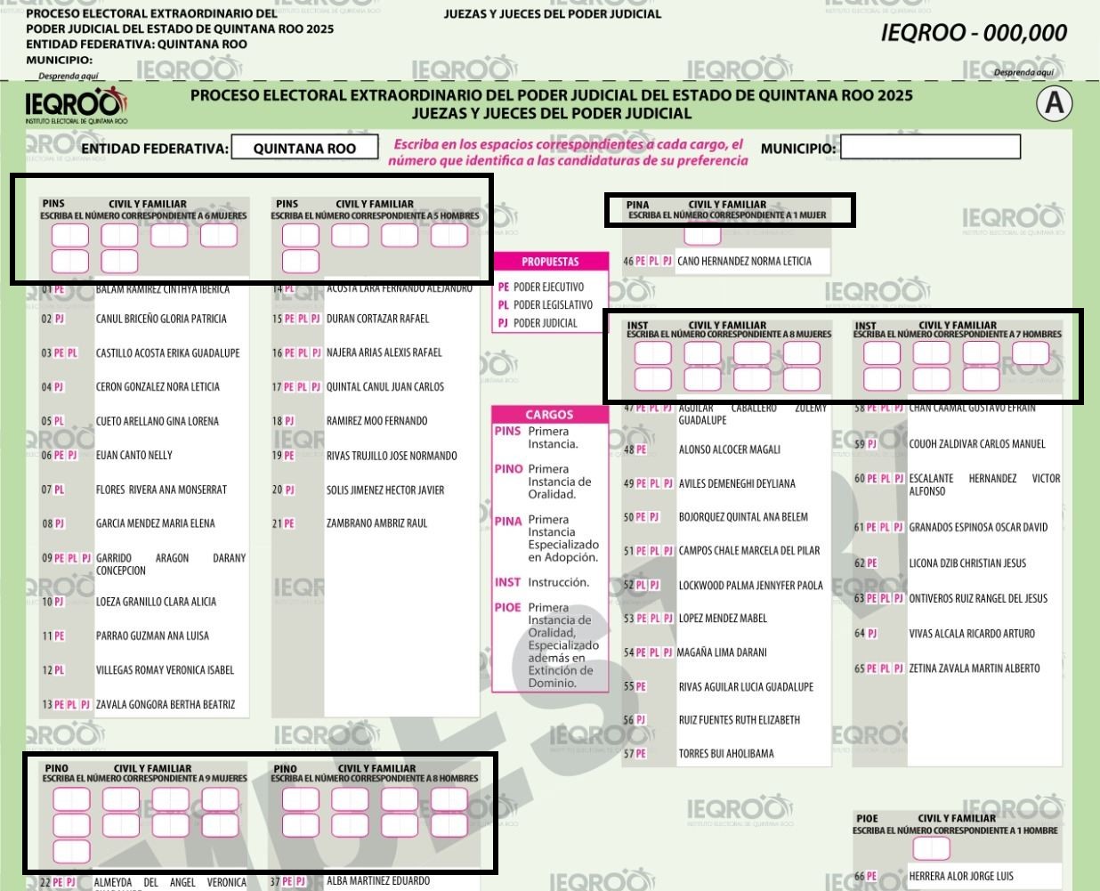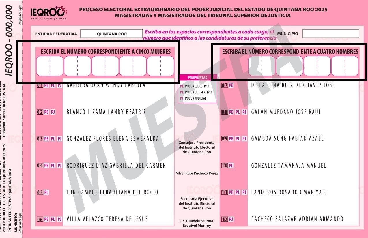 Debido a lo que establece la Ley Electoral, el Ieqroo diseñó boletas en las que el ciudadano debe escribir el número de los candidatos individuales de su preferencia en los recuadros que vienen para cada cargo, que serían los números identificadores de 5 mujeres y 4 hombres para el Tribunal Superior de Justicia; los de 2 mujeres y un hombre para el Tribunal de Disciplina Judicial; y hasta 20 números de candidatas y 19 de candidatos a jueces penales; de 3 candidatas y un candidato a juez mercantil; y hasta de 24 candidatas y 21 candidatos a jueces civiles y familiares, por mencionar la mayoría los casos, forma de votación que ha sido echada para abajo por la sentencia del tribunal.