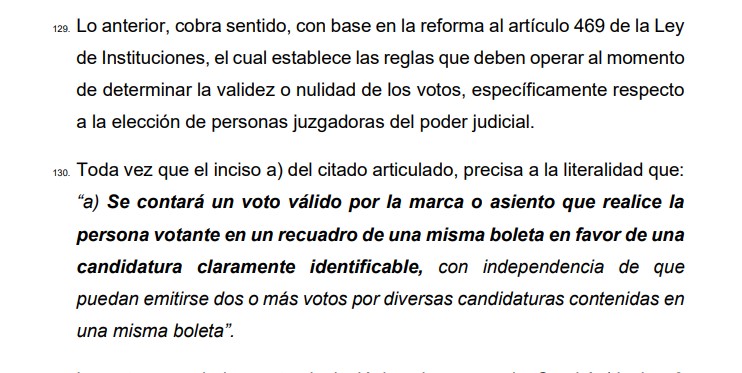 Y para fundamentar eso, cita el artículo el inciso a) del artículo 469 de la Ley Electoral del Estado, donde se indica que: “Se contará un voto válido por la marca o asiento que realice la persona votante en un recuadro de una misma boleta en favor de una candidatura claramente identificable, con independencia de que puedan emitirse dos o más votos por diversas candidaturas contenidas en una misma boleta”.