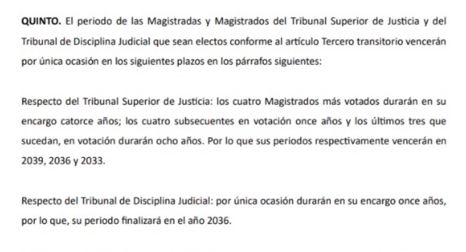 Según los artículos transitorios de la reforma a la Ley Electoral, en esta elección para el Tribunal Superior de Justicia los cuatro magistrados más votados durarán en su cargo 15 años; los cuatro que sigan en votación durarán 11 años; y los restantes, que en el caso de esta elección sería uno más, durará 8 años.