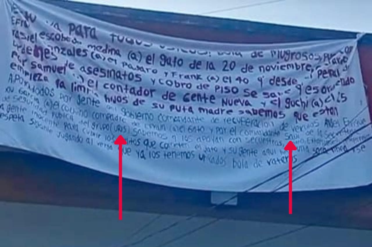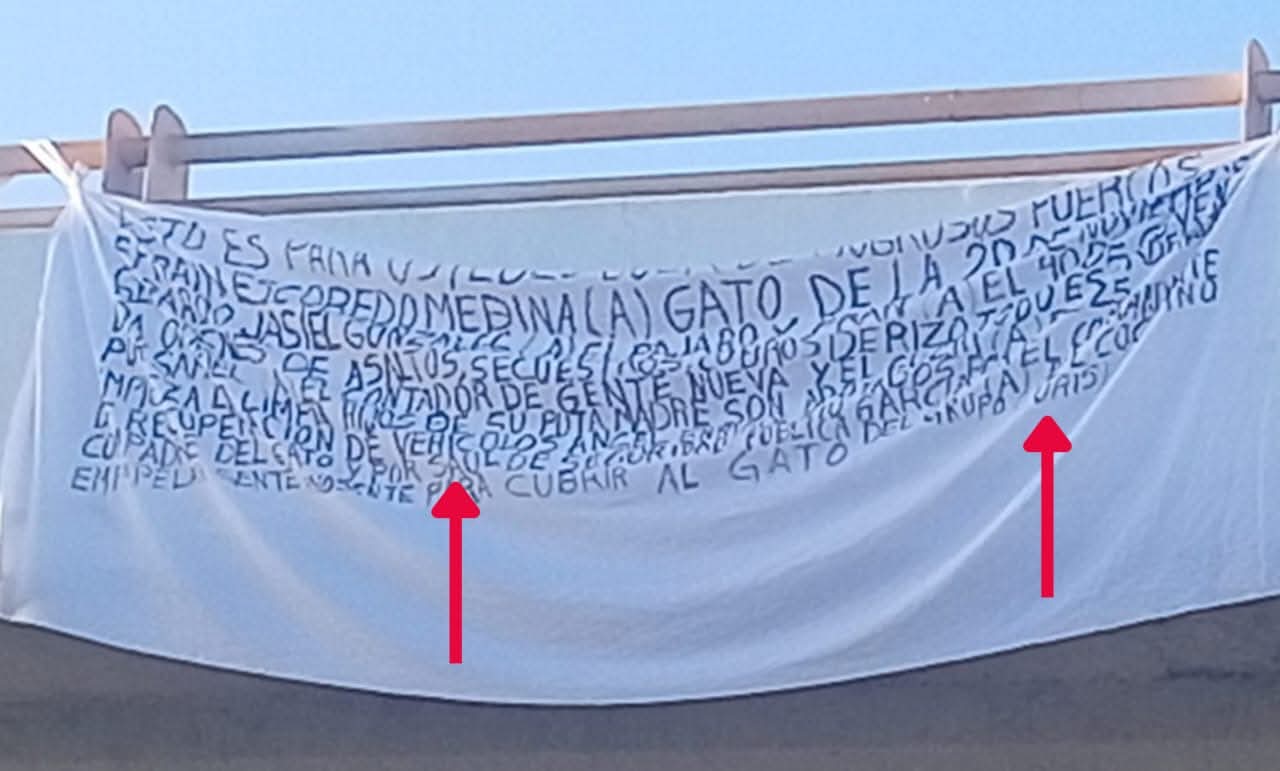 En los mensajes que fueron escritos en mantas, se deja implícito la existencia de un conflicto entre dos grupos delincuenciales. Asimismo, es necesario mencionar que el predio y vehículo baleados el martes pasado en la colonia 20 de Noviembre, pertenecerían al famoso “Gato”.