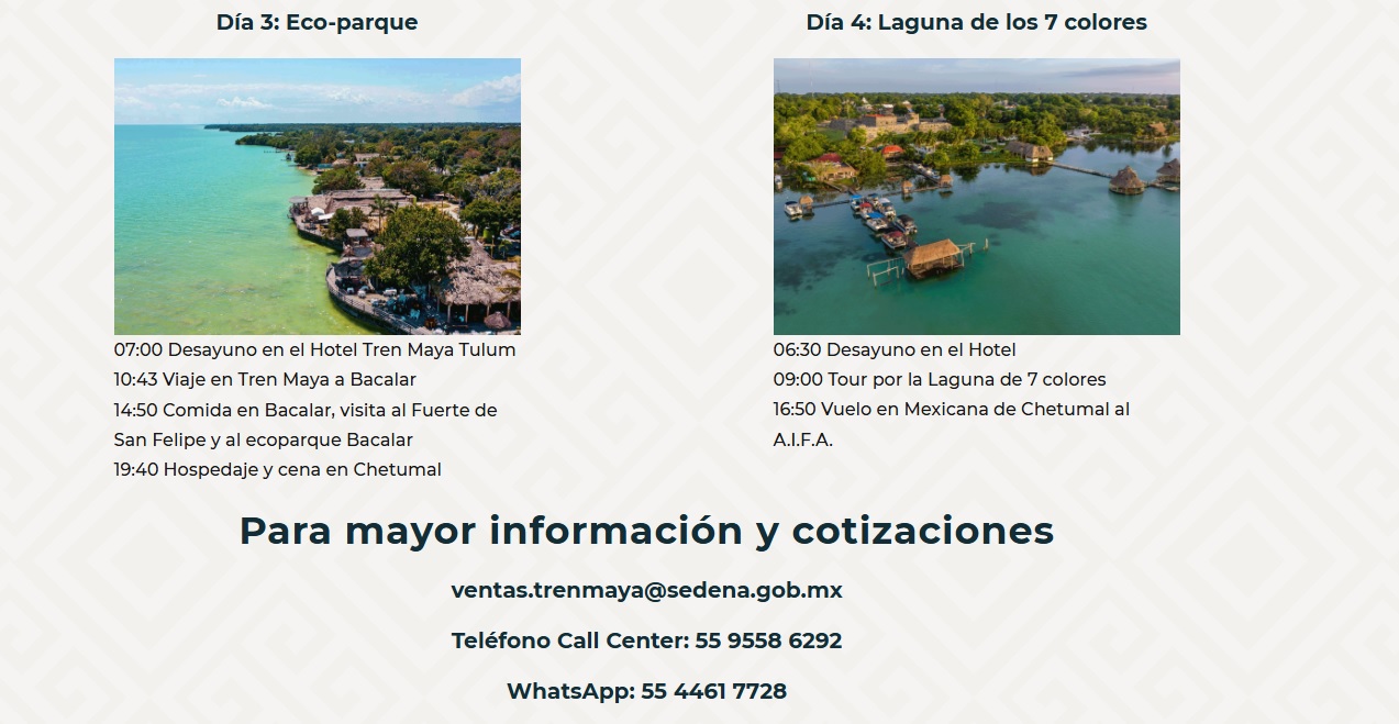 Posteriormente, los turistas abordarán el Tren Maya para dirigirse a Bacalar, donde conocerán el Fuerte de San Felipe y la emblemática Laguna de los Siete Colores, además de realizar una visita a sus cenotes cristalinos. El viaje concluye en Chetumal, desde donde se regresará al Aeropuerto Internacional Felipe Ángeles (AIFA).