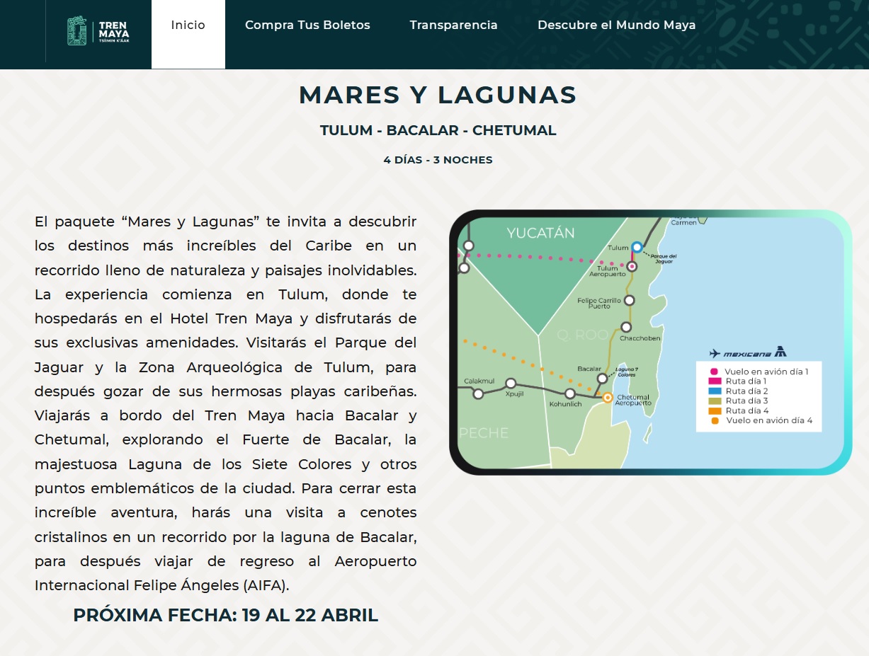 El primero de estos paquetes lleva por nombre “Mares y Lagunas” y ofrece un recorrido de cuatro días y tres noches por Tulum, Bacalar y Chetumal. Con un costo de 16 mil 430 pesos, esta experiencia comienza en el Hotel Tren Maya de Tulum, donde los visitantes podrán disfrutar de amenidades exclusivas antes de explorar el Parque del Jaguar y la Zona Arqueológica de Tulum.