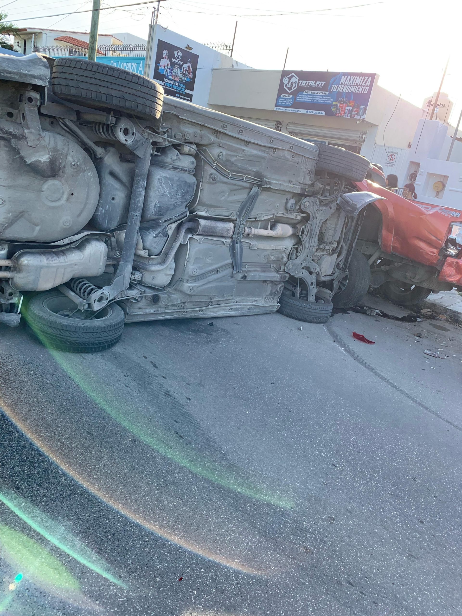 ► El percance ocurrió en la avenida Benito Juárez, donde un vehículo terminó volcado tras impactar contra una camioneta