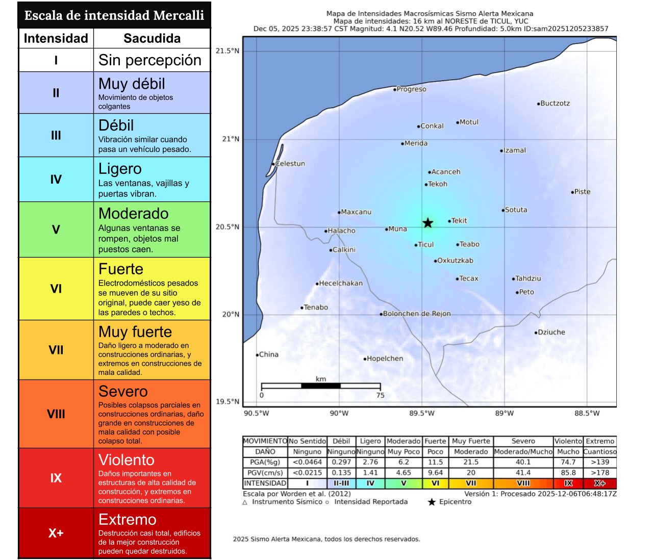 Según el SSN, el epicentro se localizó 16 kilómetros al noreste de Ticul, con coordenadas 20.52° de latitud y -89.46° de longitud y la misma profundidad de 5 kilómetros.