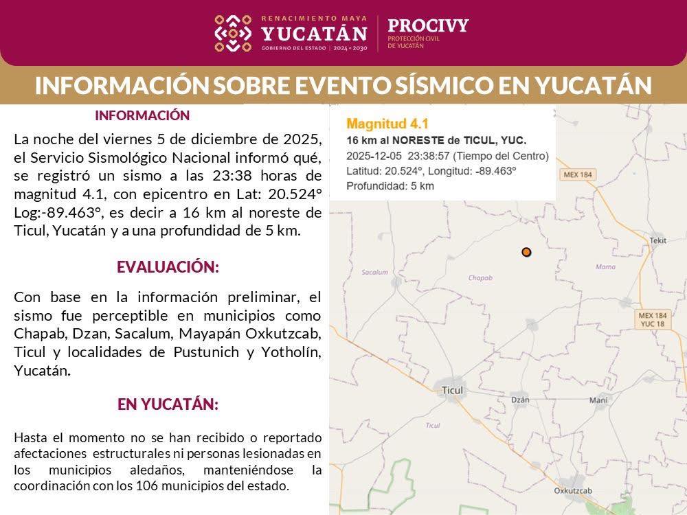 Protección Civil de Yucatán confirmó que el sismo no representa riesgo para la población y exhortó a seguir los protocolos básicos: verificar la integridad de estructuras, evitar rumores y mantenerse informados por canales oficiales.