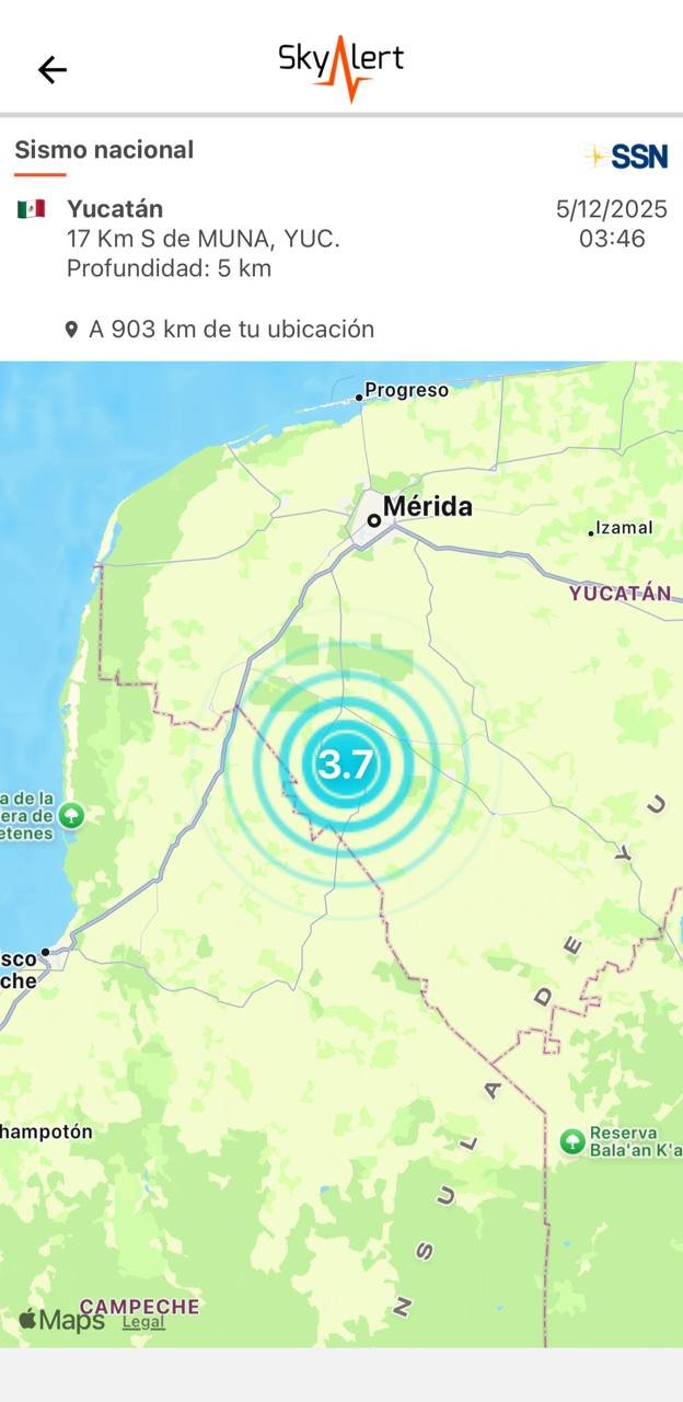 Yucatán se despertó la madrugada del Viernes con una noticia inusual, dos sismos consecutivos sacudieron el sur del estado, el Servicio Sismológico Nacional (SSN) confirmó un primer temblor de magnitud 3.5 a las 03:44 horas, localizado 17 kilómetros al sur de Muna con coordenadas 20.33° de latitud y -89.69° de longitud, y una profundidad de 5 kilómetros. Solo dos minutos después, a las 03:46 horas, se registró un segundo movimiento de magnitud 3.7 en el mismo punto.