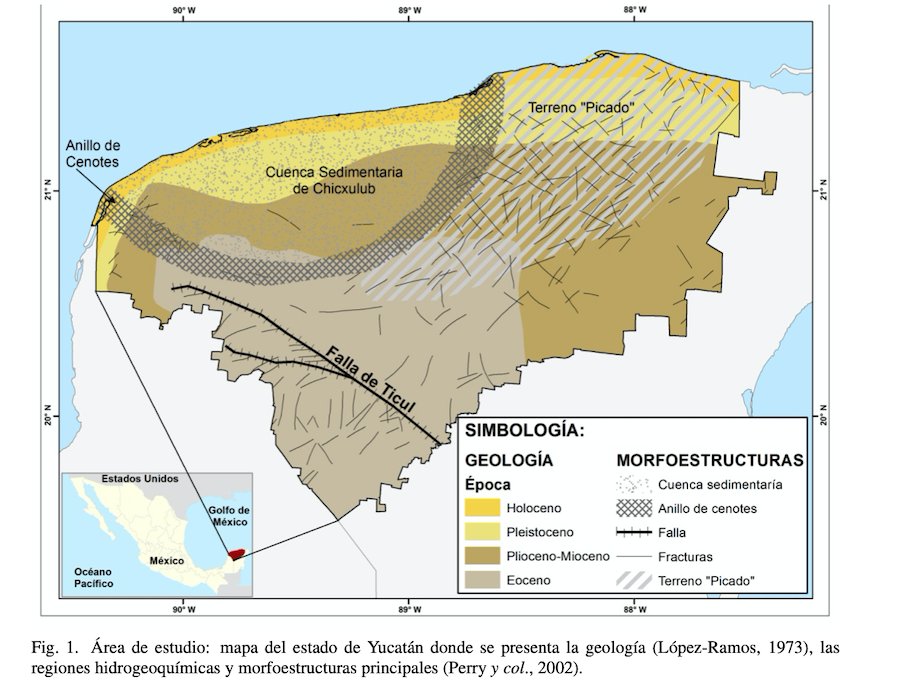 La península de Yucatán está formada por un terreno kárstico, una roca caliza altamente porosa con cavernas y cenotes.
