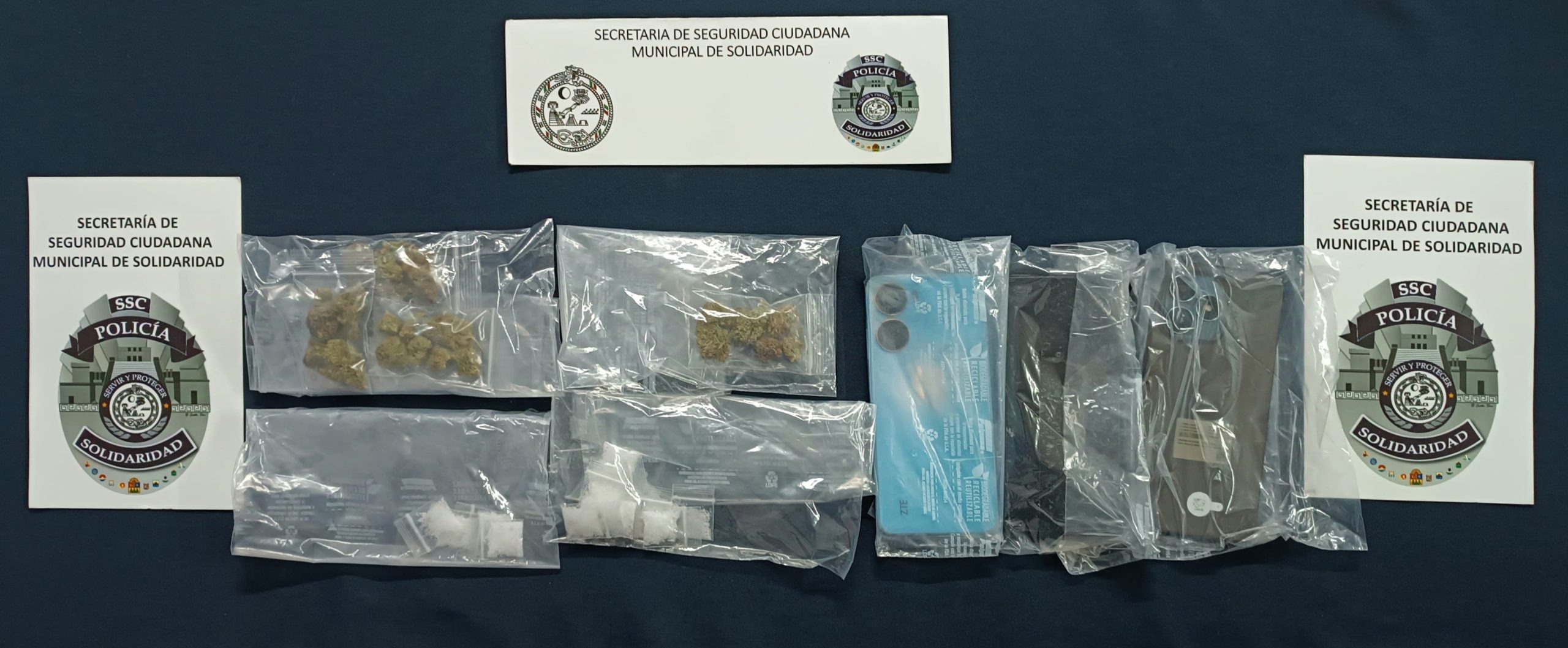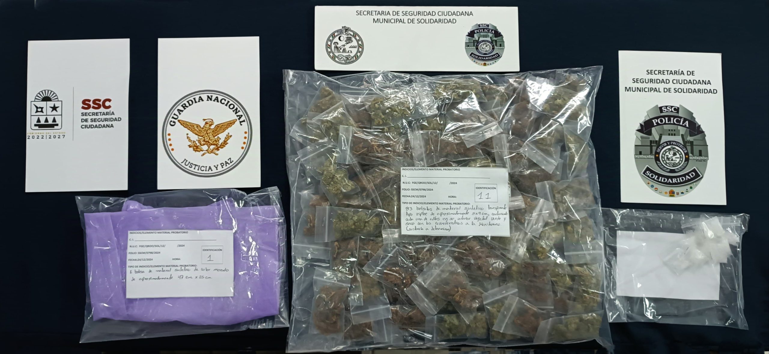 En una primera intervención la SSCM de Solidaridad detienen a dos personas del sexo masculino, a los cuales aseguraron 19 posibles dosis de narcóticos y una motocicleta, durante un recorrido de vigilancia en la colonia Luis Donaldo Colosio.