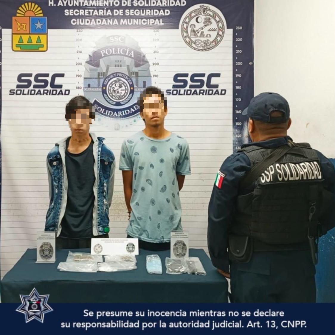 En una primera intervención la SSCM de Solidaridad detienen a dos personas del sexo masculino, a los cuales aseguraron 19 posibles dosis de narcóticos y una motocicleta, durante un recorrido de vigilancia en la colonia Luis Donaldo Colosio.