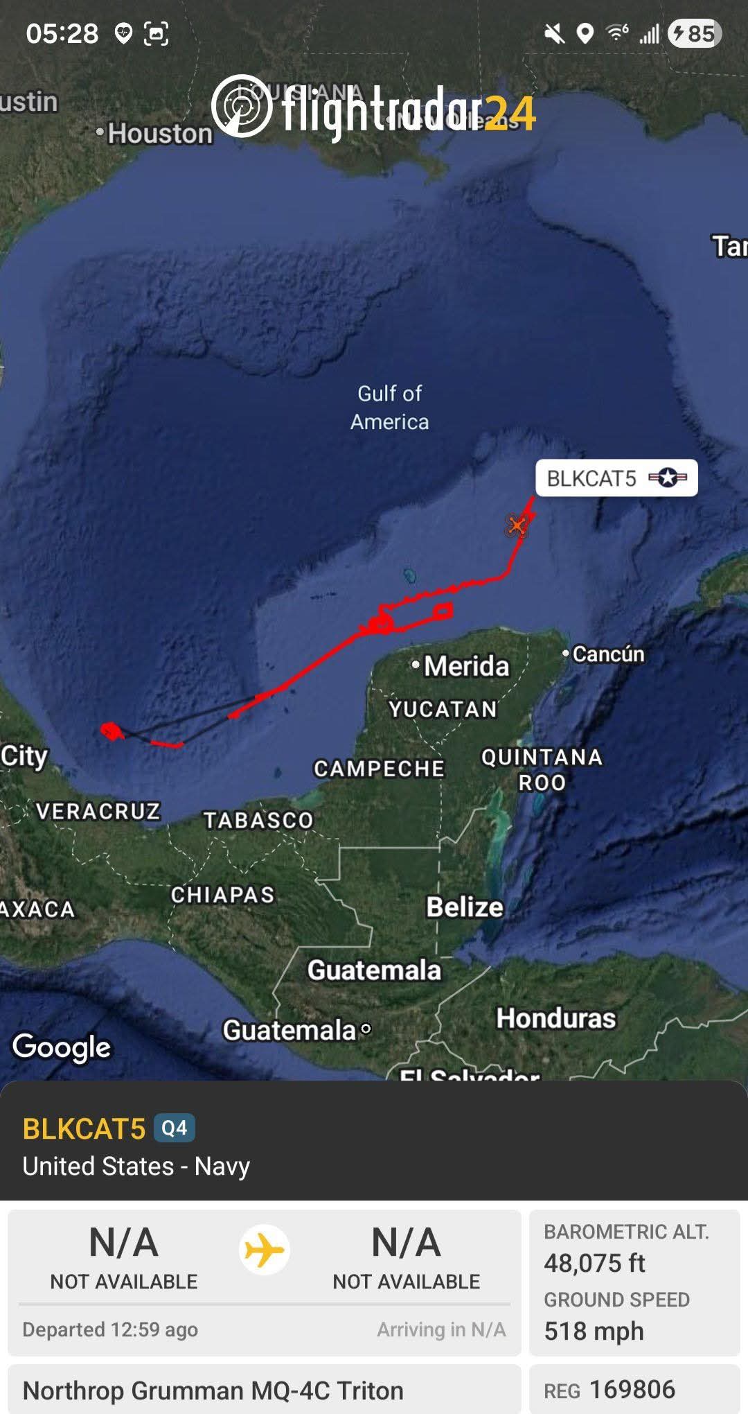Asimismo, de acuerdo con la publicación Código Magenta, durante las primeras horas de este jueves, una aeronave no tripulada de la Marina de Estados Unidos realizó trayectorias frente a las costas mexicanas de Yucatán, Campeche, Tabasco y Veracruz.
