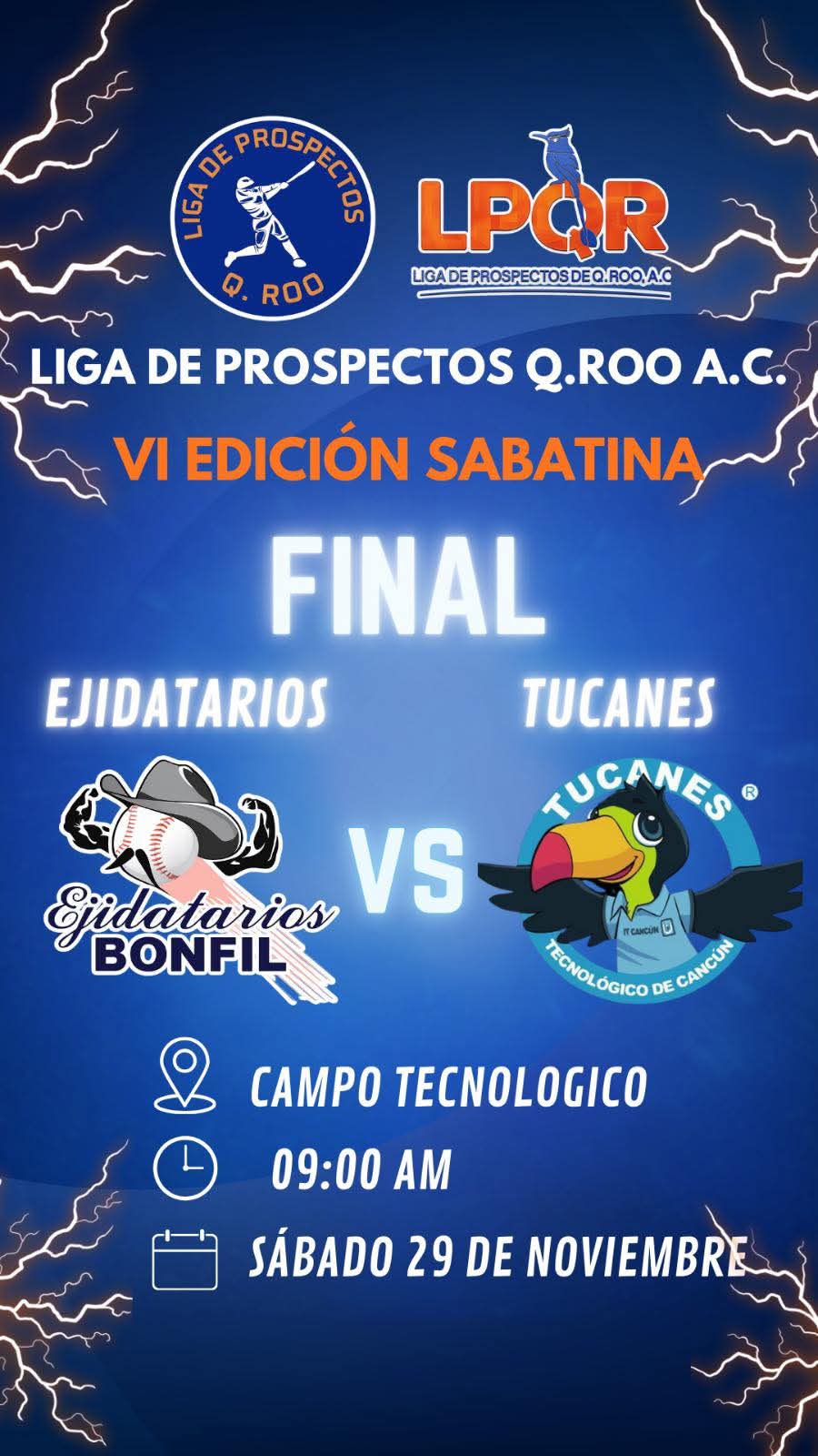 Es así como este sábado 29 de noviembre a las 9:00 horas en el campo del ITC, se jugará el primer juego de la Serie Final de la VI edición de la LPQR Juvenil Sabatina entre los Tucanes y Ejidatarios, en tanto que el segundo desafío ha sido programado para el 6 de diciembre en el “Félix ‘Chano’ Flores” de Bonfil.