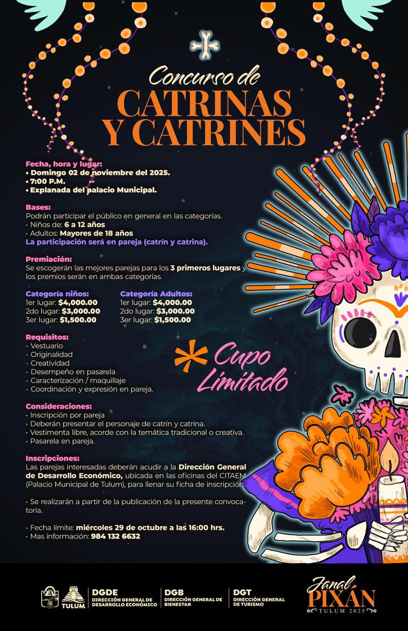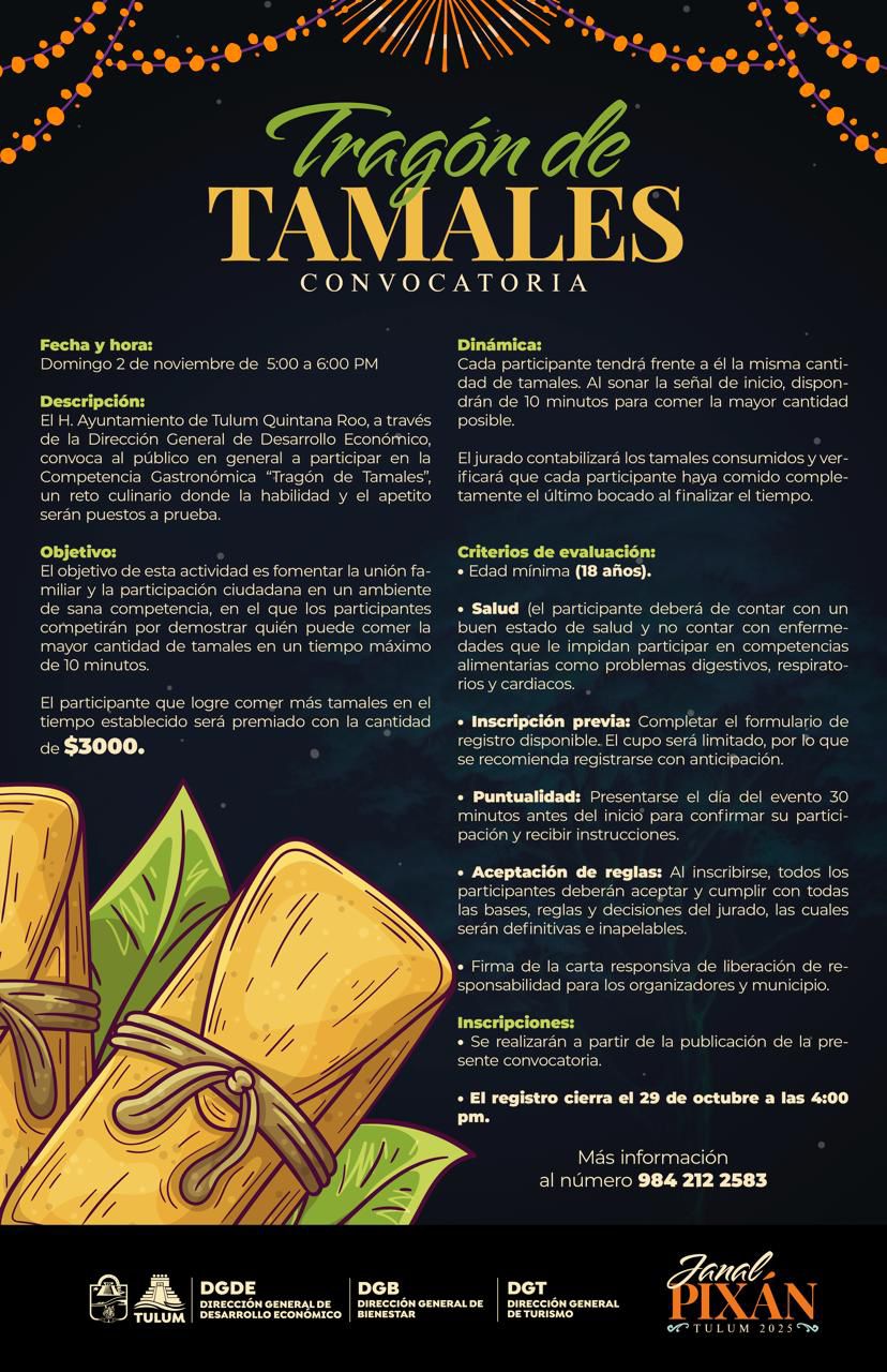 TULUM a 24 de octubre .— El Ayuntamiento de Tulum anunció una serie de actividades culturales y recreativas en el marco del Festival “Janal Pixán Tulum 2025”, con el propósito de preservar las tradiciones del Día de Muertos y fortalecer la identidad maya peninsular. Entre los eventos destacan los concursos de Disfraces, Altares, Catrinas y Catrines, así como la competencia gastronómica “Tragón de Tamales”, con atractivos premios en efectivo.