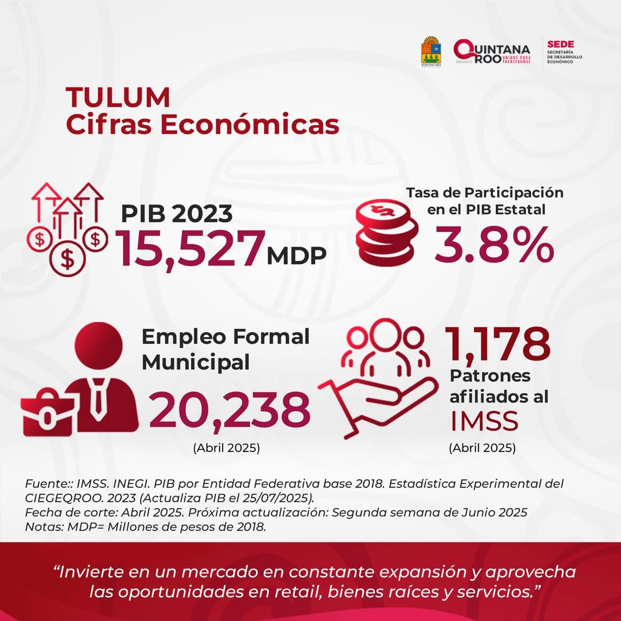 El crecimiento del municipio se refleja también en el empleo formal: hasta abril de 2025 se registraron 20,238 trabajadores afiliados al IMSS, una cifra que confirma el dinamismo del mercado laboral tulumnense. A la par, se contabilizan 1,178 patrones que actualmente operan en el municipio, lo que muestra la confianza del sector empresarial en el desarrollo económico local.