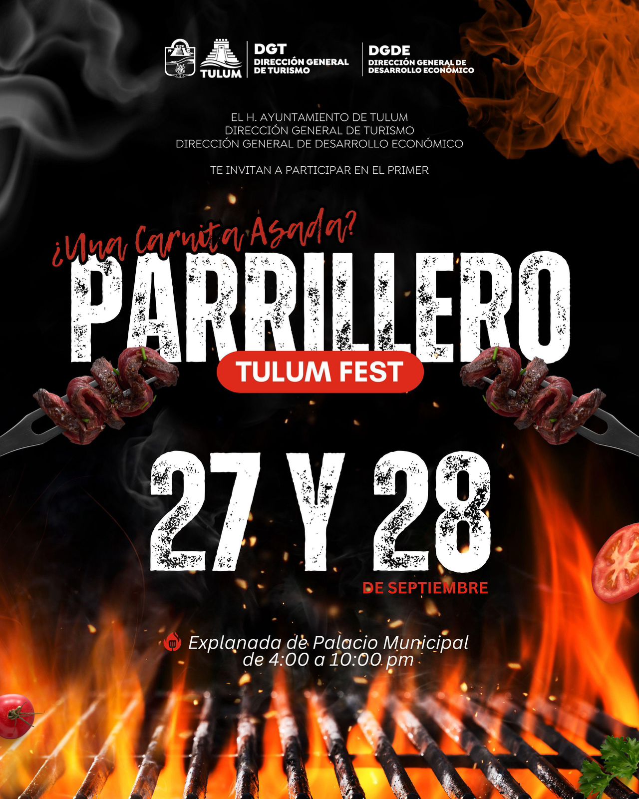 TULUM a 20 de septiembre .– El próximo 27 y 28 de septiembre se llevará a cabo el primer “Parrilero Tulum Fest”, un evento gastronómico organizado por el H. Ayuntamiento de Tulum a través de la Dirección General de Turismo y la Dirección General de Desarrollo Económico. La cita será en la explanada del Palacio Municipal, en un horario de 4:00 de la tarde a 10:00 de la noche.