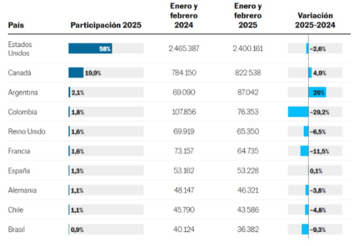 El intenso intercambio comercial y de movilidad entre los tres países de Norteamérica, hoy en vilo por la guerra comercial que mantiene Donald Trump con el mundo, revela una correspondencia directa con el turismo: estadounidenses y canadienses concentran más del 77% de entradas al país con fines turísticos, de acuerdo con cifras oficiales para los primeros dos meses de 2025. Estados Unidos concentra el 58% de visitantes que ingresaron al país por aire en el primer bimestre, con poco más de 2,4 millones de viajeros. El segundo sitio corresponde a Canadá (19,9%), con 822.538 turistas que aterrizaron en algún aeropuerto nacional entre enero y febrero de 2025.