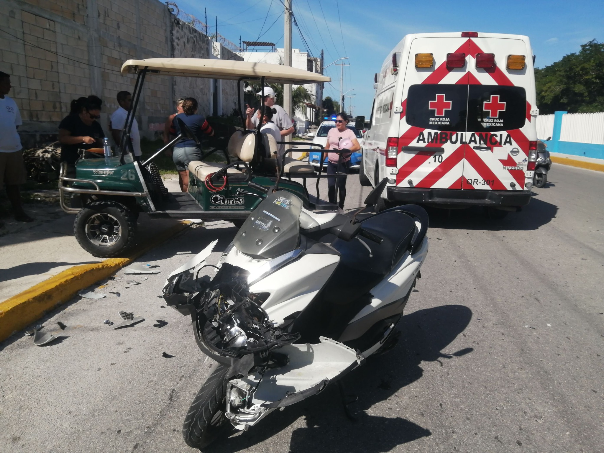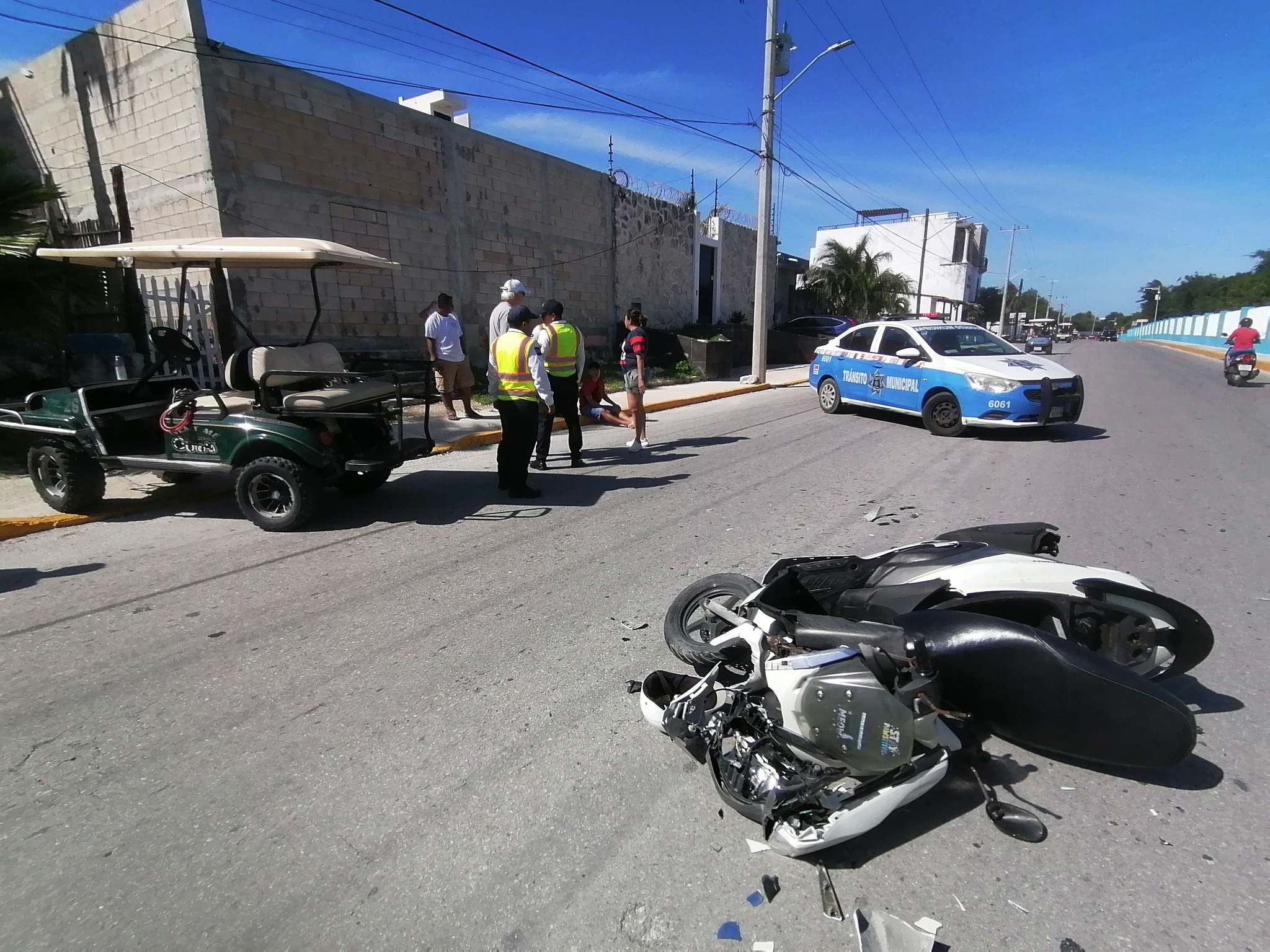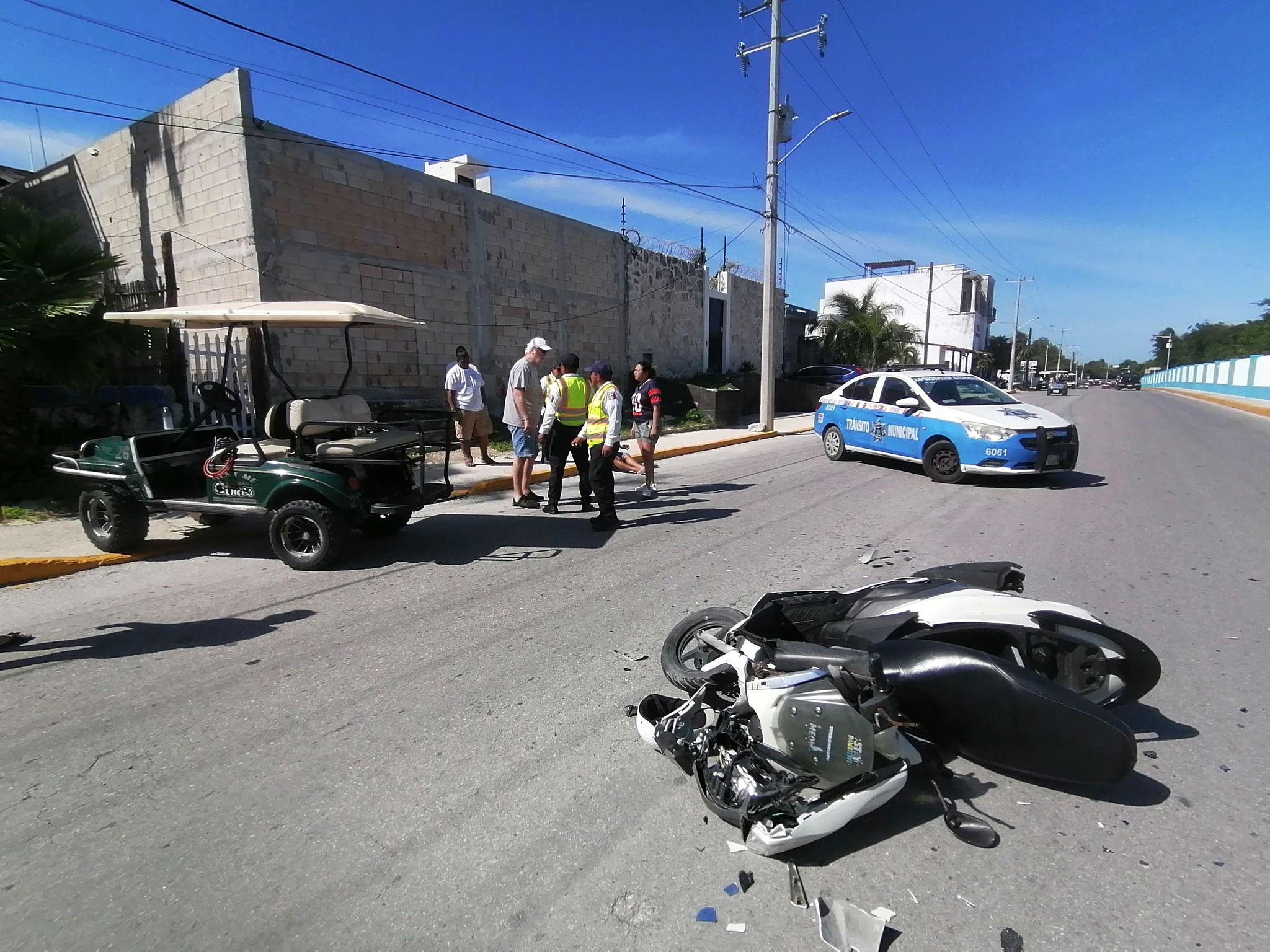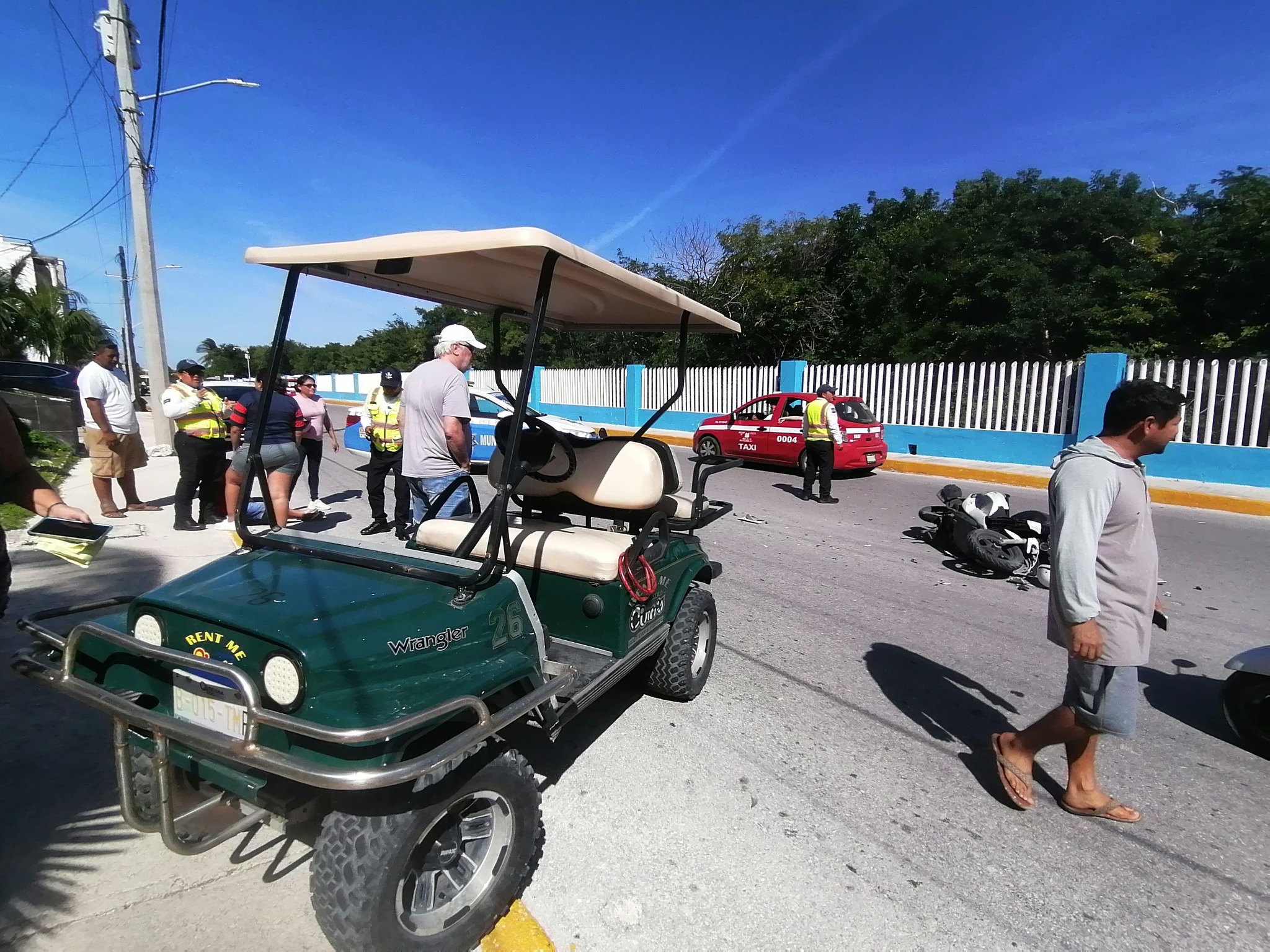 Los hechos se registraron pasado el mediodía de este viernes e involucraron al carrito de golf de la arrendadora Ciro’s, con número económico 26 y placas de circulación B-015-TMR y a una motocicleta Honda color blanco, de la que no se tienen mayores datos.